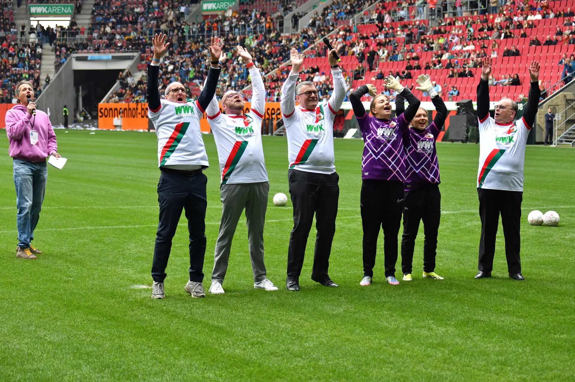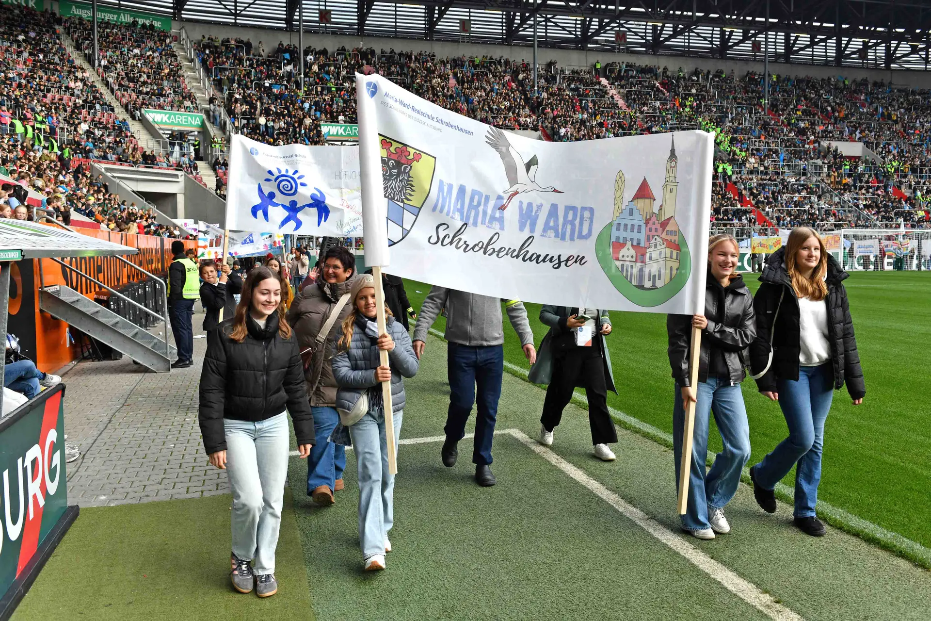 Augsburg (pba). Selbst gestaltete Schulbanner im Wind, jugendliches Stimmengewirr und erwartungsvolle Gesichter: Die Freude auf ein Heimspiel der besonderen Art war in der in weiten Teilen voll besetzten WWK Arena in Augsburg regelrecht zu spüren. Wo sonst die Fußballprofis des FCA angefeuert und bejubelt werden, wehte an diesem Freitag ein anderer Teamgeist durch die Ränge – der Geist der gesamten Schulfamilie des Schulwerks der Diözese Augsburg. Mehr als 20.000 Schülerinnen und Schüler sowie rund 2.300 Mitarbeitende aus 46 Schulen waren zur großen Geburtstagsfeier des Schulträgers aus allen Teilen des Bistums gekommen.