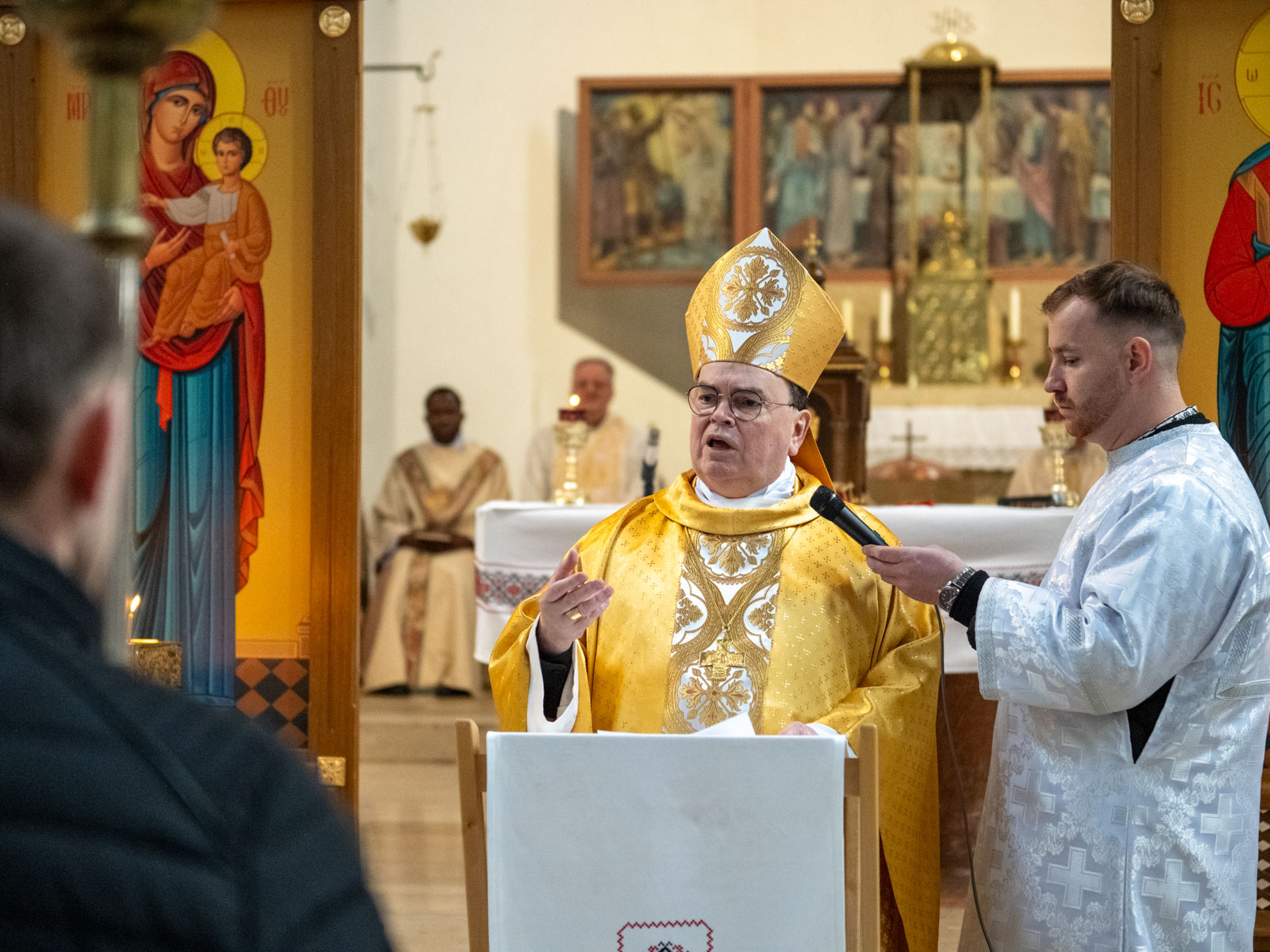 In seiner Predigt nahm der Bischof Bezug auf das Evangelium mit dem Gleichnis vom Gericht des Menschensohnes über die Völker, das in der Chrysostomus-Liturgie vorgetragen wurde. Freilich handele es sich dabei nicht nur um „eine endzeitliche Vision, die wir zur Kenntnis nehmen, um uns dann wieder dem irdischen Alltag zuzuwenden“; stattdessen sei sie eine direkte Aufforderung Gottes an uns Menschen im Hier und Jetzt, unser Handeln nach seinen Maßstäben auszurichten: „Wir werden einmal nach unserer Menschlichkeit gerichtet werden – nicht mehr, aber auch nicht weniger!“ In diesem Zusammenhang sprach er auch dem am Festtag erkrankten ukrainisch-katholischen Exarchen Bohdan Dsjurach seine größte Anerkennung aus: „Vom ersten Moment an hast Du Dich von München aus in ganz Bayern und Deutschland, ja in Europa unermüdlich für Deine Landsleute eingesetzt und wirbst auf allen Ebenen unter zunehmend schwierigeren gesellschaftlichen Bedingungen für eine gelebte Willkommenskultur, christliche Gastfreundschaft und geschwisterliche Liebe.“