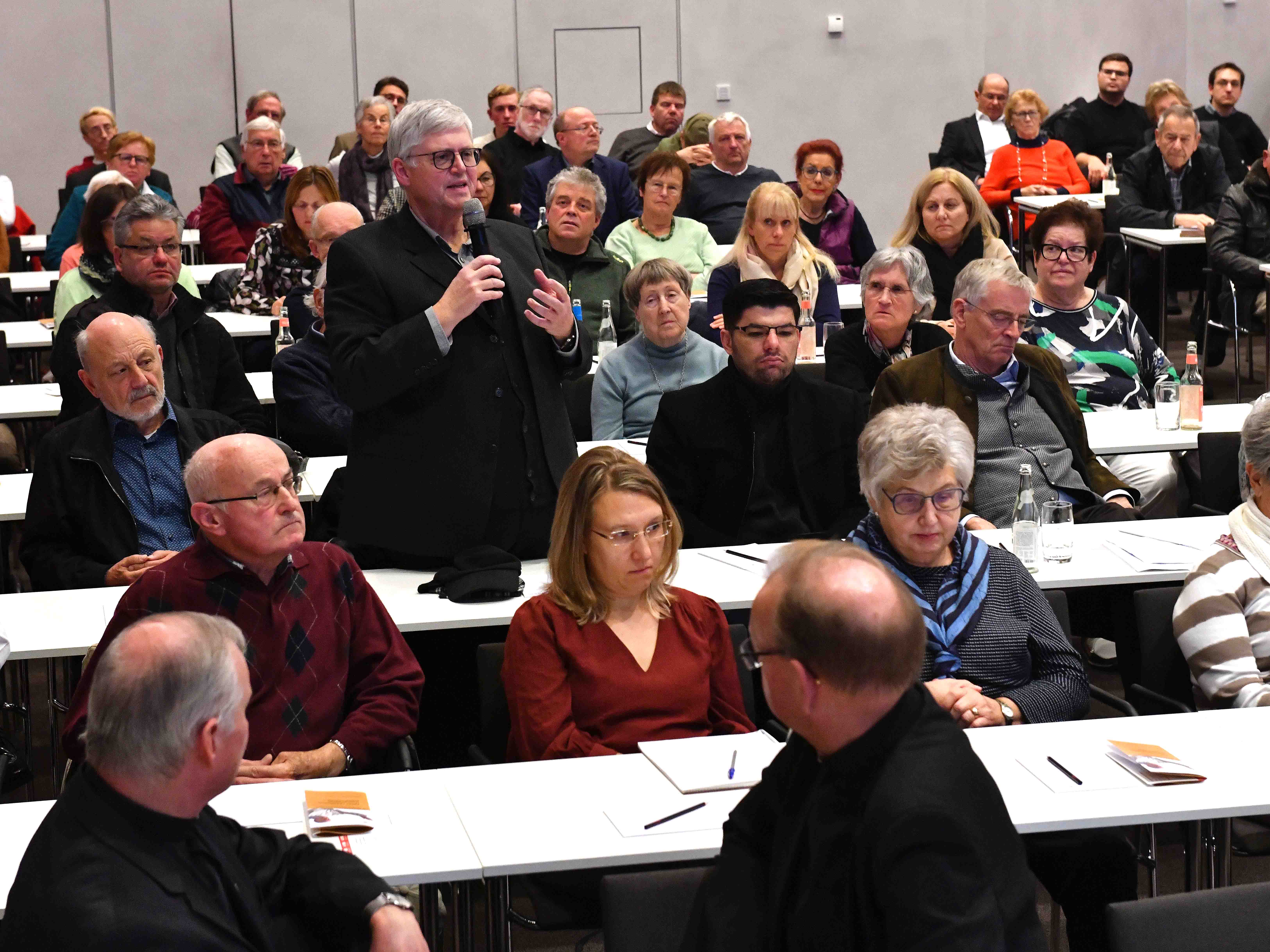 Bischof Bertram nahm die Besucherinnen und Besucher anschaulich auf eine Reise durch die Weltsynode mit. Die Atmosphäre, so begann er, war "alles andere als angespannt, Es gab große Verschiedenheit, aber wir haben uns nie hochgeschaukelt. Es war eine sehr entspannte Atmosphäre - etwas, das uns in Deutschland im Ringen um den richtigen Weg manchmal abhanden gekommen ist."