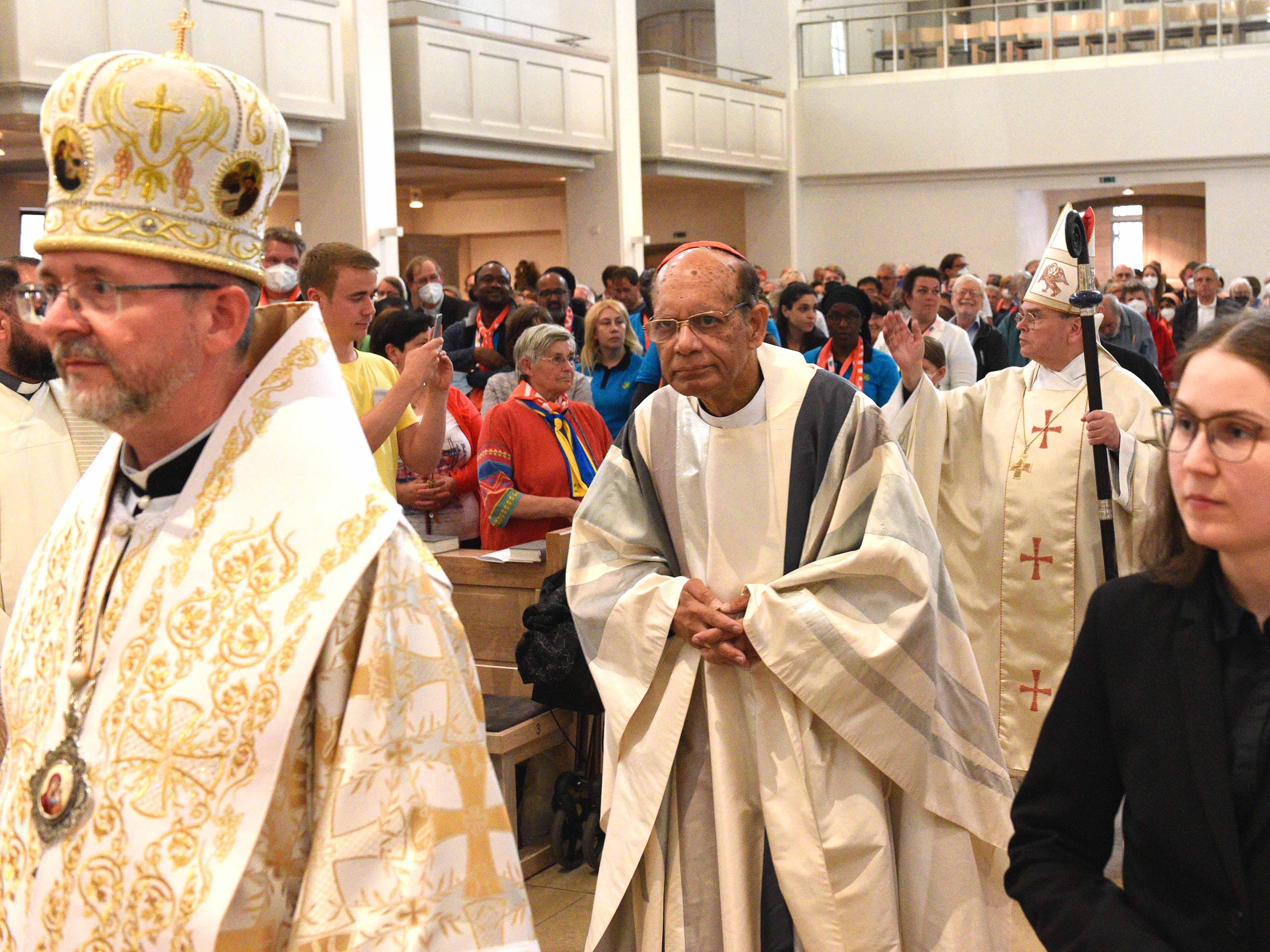 Es war ein wirklich weltkirchlicher Gottesdienst, den die Menschen in der Stuttgarter Innenstadt miterlebten: Neben Bischof Bertram konzelebrierten unter anderem der Erzbischof von Bombay, Kardinal Oswald Gracias, der Erzbischof von Bagdad, Kardinal Louis Sako, und der Apostolische Exarch für die Ukrainer des byzantinischen Ritus in Deutschland und Skandinavien, Bischof Bohdan Dzyurakh.