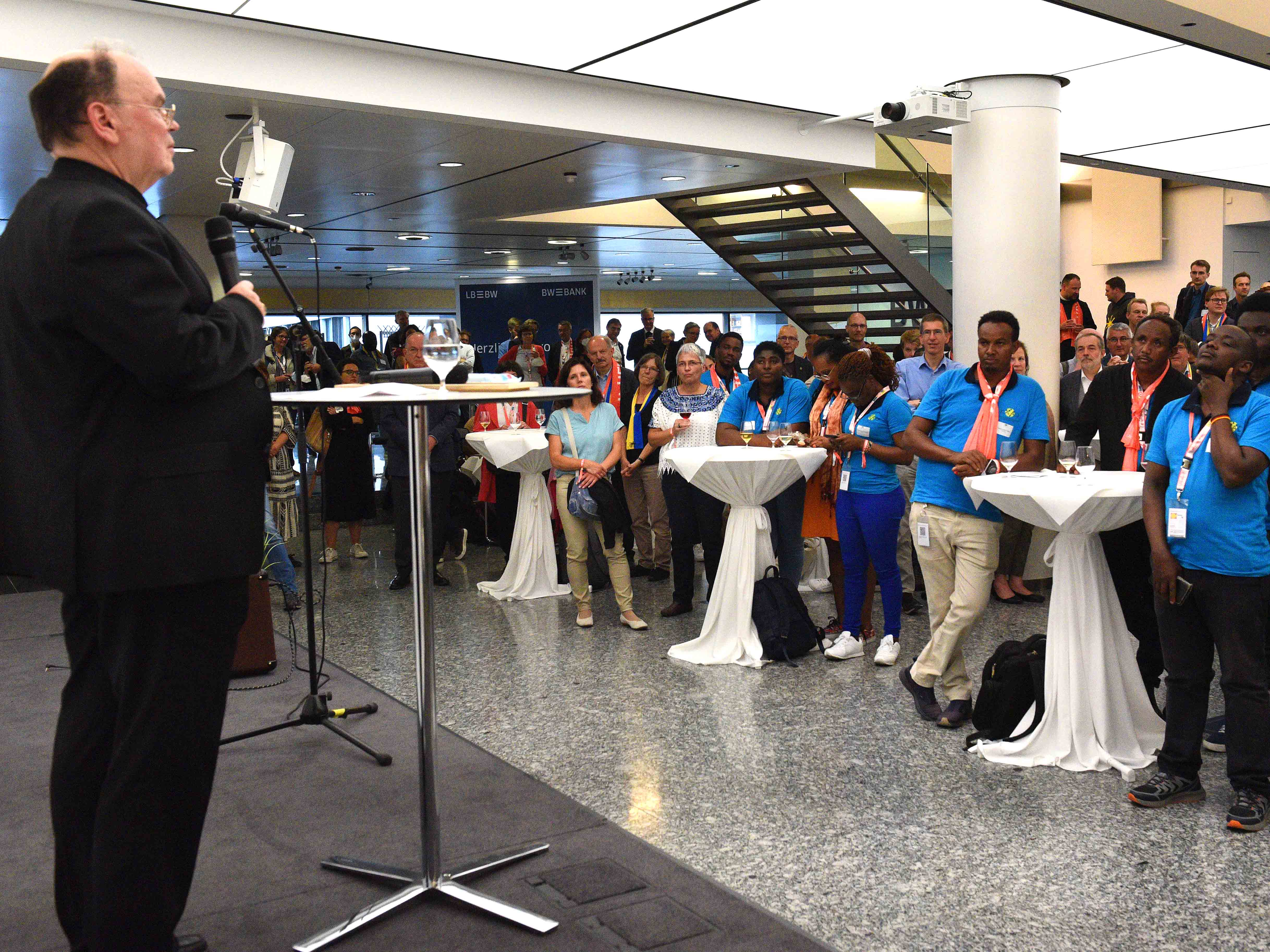 Beim anschließenden weltkirchlichen Empfang erinnerte Bischof Bertram daran, dass synodale Prozesse auf der weltkirchlichen Ebene immer zweigleisig sein müssten: „Es ist gut, wenn wir unsere Ideen, die Kirche zu erneuern, in den Kontext der Weltkirche einbetten und uns den Fragen stellen, die von unseren Partnerinnen und Partnern, unseren Schwestern und Brüdern in der Einen Welt an uns herangetragen werden. Wir Deutsche können davon nur profitieren. Das heißt im Umkehrschluss: Wir gehen unseren Weg als Kirche in Deutschland nicht allein, wir brauchen Euch – Eure Gedanken, Kritik, Ermutigung, auch Korrektur.