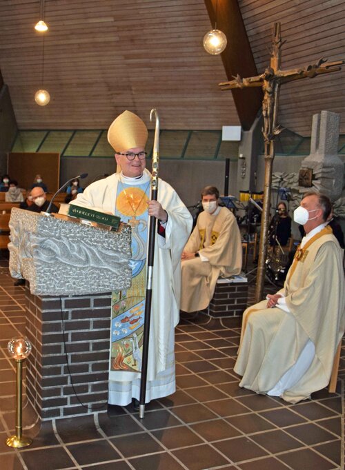 In seiner Predigt ging Bischof Bertram, der die Wallfahrt im kommenden Juni begleiten wird, auf wesentliche Gedanken Franziskus‘ ein. Sein heutiges Messgewand sei ein „Franziskusgewand“, auf dem vorne der Sonnengesang „Frate Sole“ dargestellt sei. Im „Frate Sole“ komme Franziskus als Bruder mit der Schwester Sonne geschwisterlich zusammen. Dieses geschwisterliche Zusammenkommen aller Geschöpfe sei eine Botschaft, die Franziskus für uns noch heute bereithalte, so der Bischof. „Wir alle sind Schwestern und Brüder“, stellte er fest. Papst Franziskus habe sich nach diesem Heiligen benannt. Nach seinem ersten Brief „Laudato Si“ sei Papst Franziskus im vergangenen Jahr nach Assisi gereist, um das Nachfolgedokument „Fratelli tutti“ zu unterzeichnen, welches ein Plädoyer für Geschwisterlichkeit sei. Der Papst schreibe darin sehr drastisch, „wenn ihr weiter die Schöpfung zerstört, dann wird es soweit kommen, dass die Schöpfung euch zerstört.“ „Bewahrung der Schöpfung ist nicht nur etwas für eine Gruppe, sondern es ist eine Querschnittsaufgabe für alle Christinnen und Christen“, sagte der Bischof.