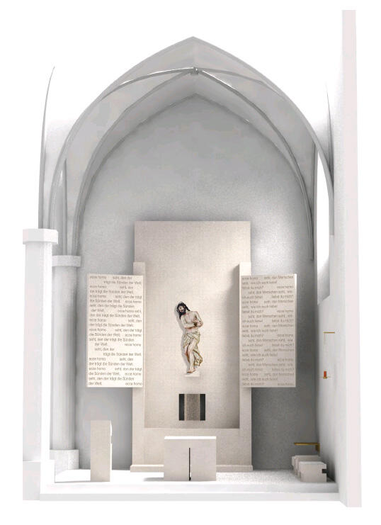 In die beiden Flügeltüren werden reliefartige Texte eingearbeitet, die bei geöffnetem Zustand gelesen werden können. Sie unterstreichen das Motiv des Ecce Homo – „Seht, welch ein Mensch“ – und können auch meditiert werden. „Sie wiederholen sich wie Perlen eines Rosenkranzes“, erklärte Architekt Huber. Sind die Flügeltüren geschlossen, wird auf den Außenseiten eine Darstellung des Weltalls sichtbar. Die Gestaltung wird dabei neueste Aufnahmen von Teleskopen aufgreifen.