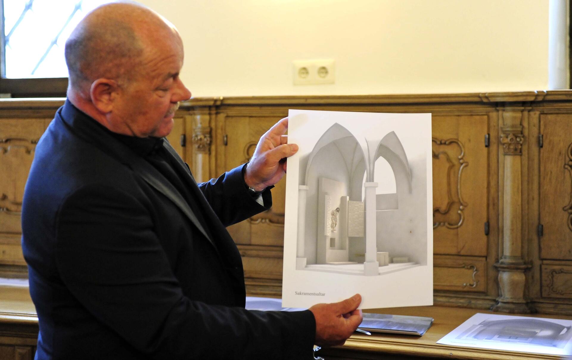„Vor uns liegt ein Entwurf des 21. Jahrhunderts, der sich auf die räumlichen Gegebenheiten einlässt“, so Diözesanbaudirektor Werner Köhler, der die Klarheit, Größe und Wertigkeit, aber auch das Gewicht dieser Baumaßnahme betonte: Der Flügelaltar wiege 20 Tonnen, die beiden Flügel jeweils 1,5 Tonnen. Die Kostenberechnung des Projekts, das bereits die Zustimmung der zuständigen diözesanen Gremien gefunden habe, belaufe sich insgesamt auf 387.000 Euro. Diese Summe wird aus den Diözesanhaushalten der Jahre 2014 und 2015 getragen.
