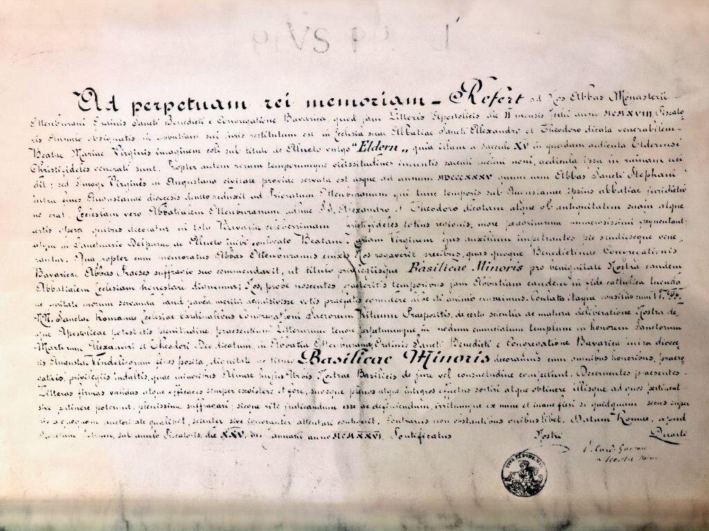 Die vom damaligen Kardinalstaatssekretär Pietro Gasparri unterzeichnete lateinische Erhebungsurkunde geht unter anderem auf die Wiederrichtung des Klosters und das Marienbildnis „Eldern“ ein. Die Abteikirche sei, wegen ihres ehrwürdigen Alters und der Kunstwerke „höchst berühmt“ und werde von zahlreichen Pilgern in der Region aufgesucht. Daher werde sie, auf Bitten des Ottobeurener Abtes und des Präses der bayerischen Benediktinerkongregation mit dem Titel und den Privilegien einer Basilica minor ausgezeichnet. Der entscheidende Satz lautet im Original: „Quapropter cum memoratus Abbas Ottenburanus enixis Nos rogaverit precibus, quas quoque Benedictinae Congregationis Bavaricae Abbas Praeses suffragio suo commendavit, ut titulo privilegiisque Basilicae minoris pro benignitate Nostra eandem Abbatialem Ecclesiam honestare dignemur.“