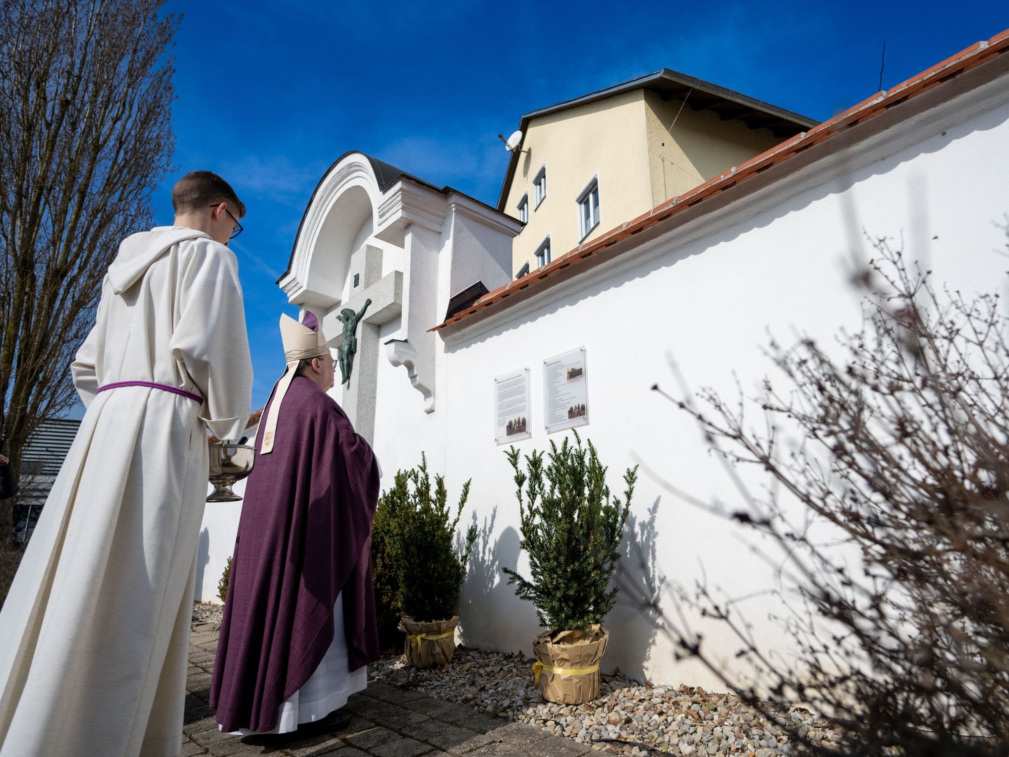 Nach dem Gottesdienst zog eine Prozession von der Kirche zur ehemaligen Friedhofsmauer, wo der Bischof zwei Gedenktafeln segnete.