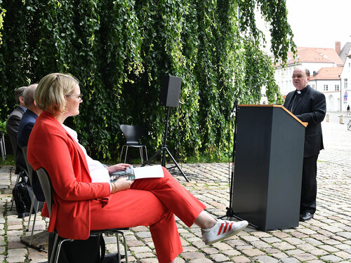 Fast täglich komme er an der Glasarche vorbei, und beinahe jedes Mal sehe er „Menschen sinnend daran vorübergehen oder still davor verharren“, so der Bischof in seiner Ansprache zur Matinee. Die Kombination aus dem Naturwerkstoff Eichenholz und dem unter hohen Temperaturen herzustellenden Kulturprodukt Glas deute auf die ambivalente Rolle des Menschen hin: „Teil der Natur zu sein und ihr zugleich entwachsen.“ Die Glasarche könne dabei Anregungen liefern zu Gedanken darüber, wie diese Doppelrolle überbrückt werden könne, sagte er und zitierte Adalbert Stifter. „Wir wollen das sanfte Gesetz zu erblicken suchen, wodurch das menschliche Geschlecht geleitet wird.“ Als Christ deute er dies als das sanfte Gesetz des Heiligen Geistes: „füreinander immer, miteinander immer öfter, nebeneinander immer seltener und gegeneinander nie mehr.“Auch Oberbürgermeisterin Weber sah in der Glasarche ein besonders eindrückliches Beispiel zeitgenössischer Kunst im öffentlichen Raum. Unwillkürlich stelle man sich bei ihrem Anblick die Frage, was das sei, was es bedeute und zuletzt: „Hat das was mit mir zu tun?“ Das gläserne Boot könne als Symbol für die Fragilität, aber auch Diversität der Schöpfung gedeutet werden. Auch in der Augsburger Region mache sich der Klimawandel immer mehr bemerkbar – insofern könne die Hand der Glasarche als die Hand der öffentlichen Verwaltung gesehen werden, die Verantwortung für die Schöpfung trage. Sie sei aber auch die Hand aller Menschen: „Wir alle können eine ganze Menge tun!“Die Matinee wurde musikalisch begleitet von den Wertacher Alphornbläsern sowie den Augsburger Domsingknaben. Zudem las der Schauspieler am Augsburger Staatstheater Klaus Müller aus dem Werkfragment „Klima“ des Schweizer Schriftstellers Max Frisch vor. Die Glasarche steht seit 23. Juni auf dem Domvorplatz und wird dort bis zum Hohen Friedensfest Anfang August verbleiben.