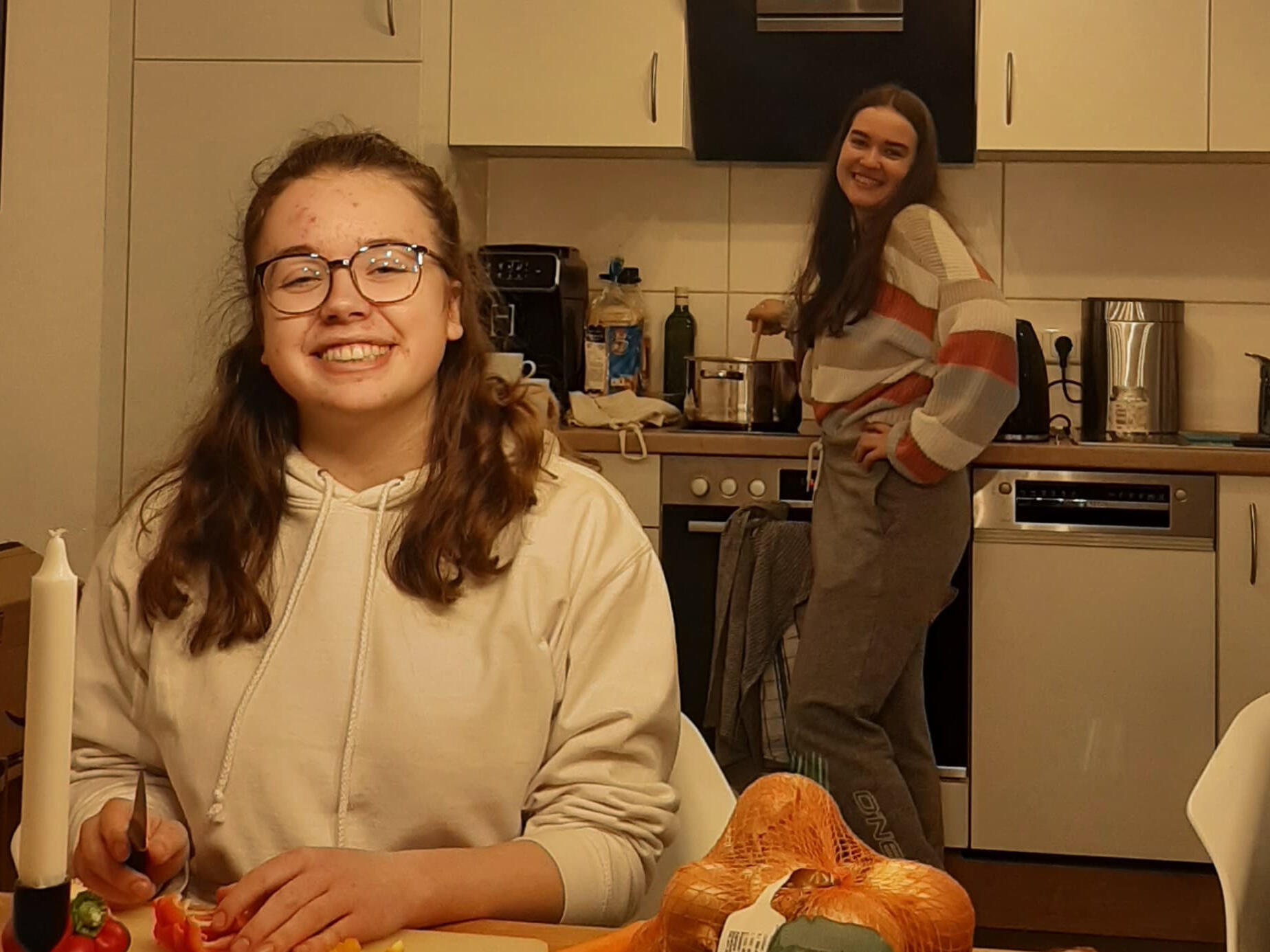 In der Küche der WG sind die Einkäufe mittlerweile alle eingeräumt und das Küchenteam am Schneiden von Gemüse. „Es gibt ‚Chili con Carne‘“, verrät Franziska, während sie eine rote Paprika von ihren Kernen befreit. „Im UP hat mir das Persönlichkeitscoaching am meisten geholfen, besonders der Stärkentest, da man sich seinen Fähigkeiten konkret nicht bewusst ist. Mir haben aber auch die Einzelgespräche mit der Referentin, wie auch mit Veronika sehr weitergeholfen. Und selbstverständlich auch der Praktikumsalltag“, lobt Franziska die besondere Unterstützung, die sie beim „UP“ hinsichtlich ihrer Berufsorientierung erfährt. Die Paprika hat sie mittlerweile in Stücke geschnitten und in den Topf zu den Zwiebeln geworfen.