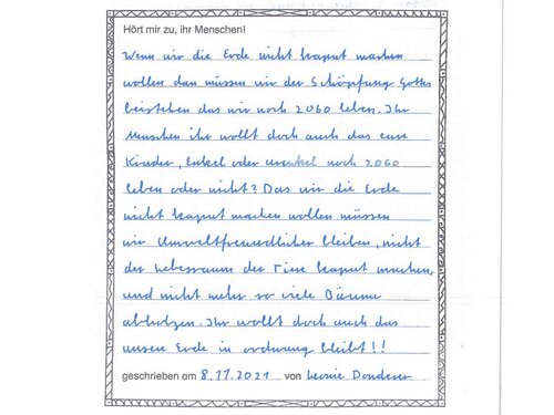„Ihr wollt doch auch, dass unsere Erde in Ordnung bleibt!!“ schreibt Leonie in ihrer Rede mit gleich zwei Ausrufezeichen. „Wenn wir die Erde nicht kaputt machen wollen, dann müssen wir der Schöpfung Gottes beistehen.“ Sie macht sich dabei ganz konkret Sorge um ihre eigene Zukunft: „Ihr Menschen wollt doch auch, dass eure Kinder, Enkel oder Urenkel noch 2060 leben, oder nicht?“