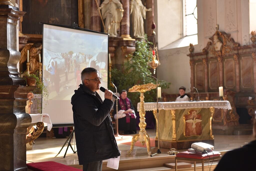 Beim Wortgottesdienst stellte Anton Stegmair von der Abteilung Mission-Entwicklung-Frieden die Situation im Südsudan vor: „Der jüngste Staat der Welt ist auch einer der ärmsten.“ Im Südsudan gebe es viele Menschen, die vor Krieg und Hunger geflohen seien. „Viele haben nicht einmal ein Dach über dem Kopf, sondern leben in Flüchtlingszelten“, erklärte er. Hilfsorganisationen wie die Ordensgemeinschaft der Salesianer Don Boscos kümmern sich um die Menschen und versuchen, ihnen Hoffnung und eine Perspektive zu geben. Mit den Spenden der Rätschaktion sollen eine Grundschule und ein Berufsbildungszentrum der Salesianer im Südsudan unterstützt werden. Anschließend betonte Pfarrer Lindl in der Predigt die Bedeutung des Engagements der Ministrantinnen und Ministranten. Er ging dabei auf die Lesung von der wunderbaren Brotvermehrung ein. Jesus habe das Wunder erst gewirkt, nachdem die Jünger das Ihre getan hätten und Brot und Fische herbeigebracht hätten. „Jesus will gemeinsame Sache machen mit uns, damit es uns und damit der Welt besser geht“, so Lindl. Die Hilfe vor Ort sei besonders wichtig, da nur so den Menschen eine gefährliche und anstrengende Flucht erspart werden könne.