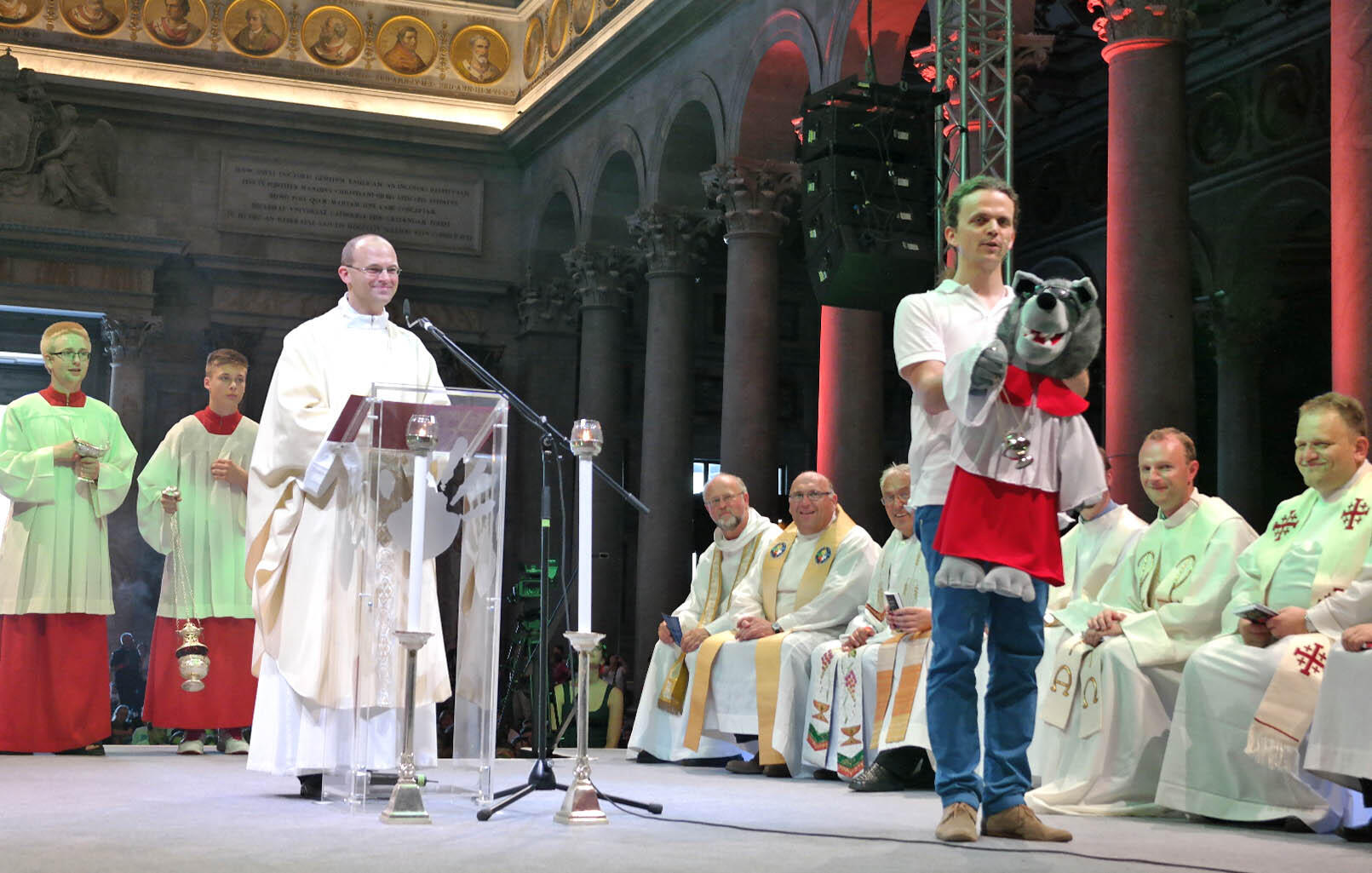 Auch Diözesanjugendseelsorger Dr. Florian Markter machte das Thema „Vertrauen“ zum Dreh- und Angelpunkt seiner Predigt und wurde dabei vom diözesanen Maskottchen, dem Wolf TrauDi, unterstützt. Mit einer Geschichte über einen Seiltänzer, der nur mit Vertrauen ans Ziel seiner wagemutigen Mission kommt, erinnerte Jugendseelsorger Markter an unsere Beziehung zu Gott: „Das Wichtigste, das Gott von uns erwartet ist, dass wir ihm Vertrauen schenken. Trau Dich Gott Dein Herz zu schenken, Ihm Dein Leben anzuvertrauen“, ermutigte der Diözesanjugendpfarrer die zahlreichen Kinder und Jugendlichen.