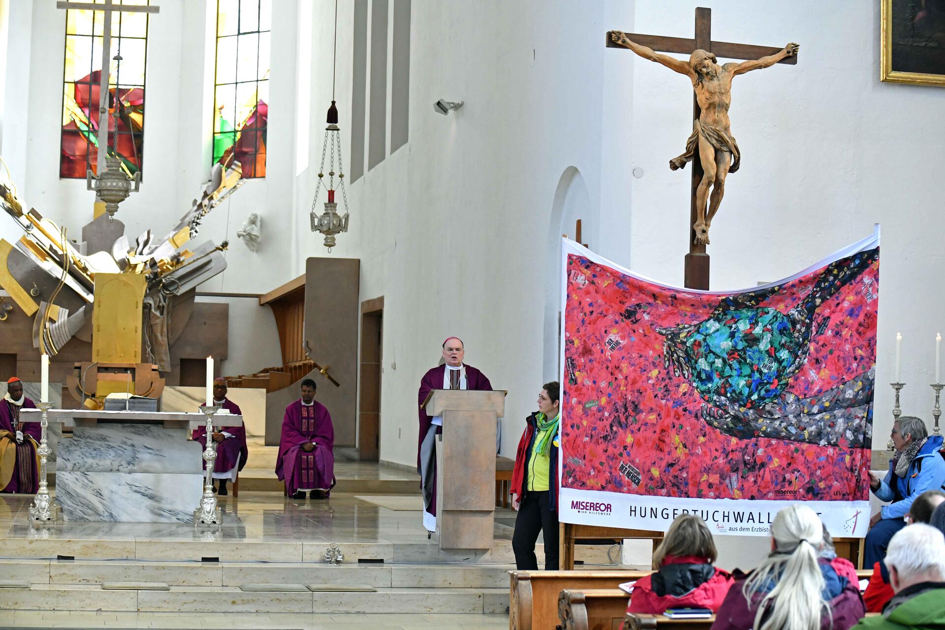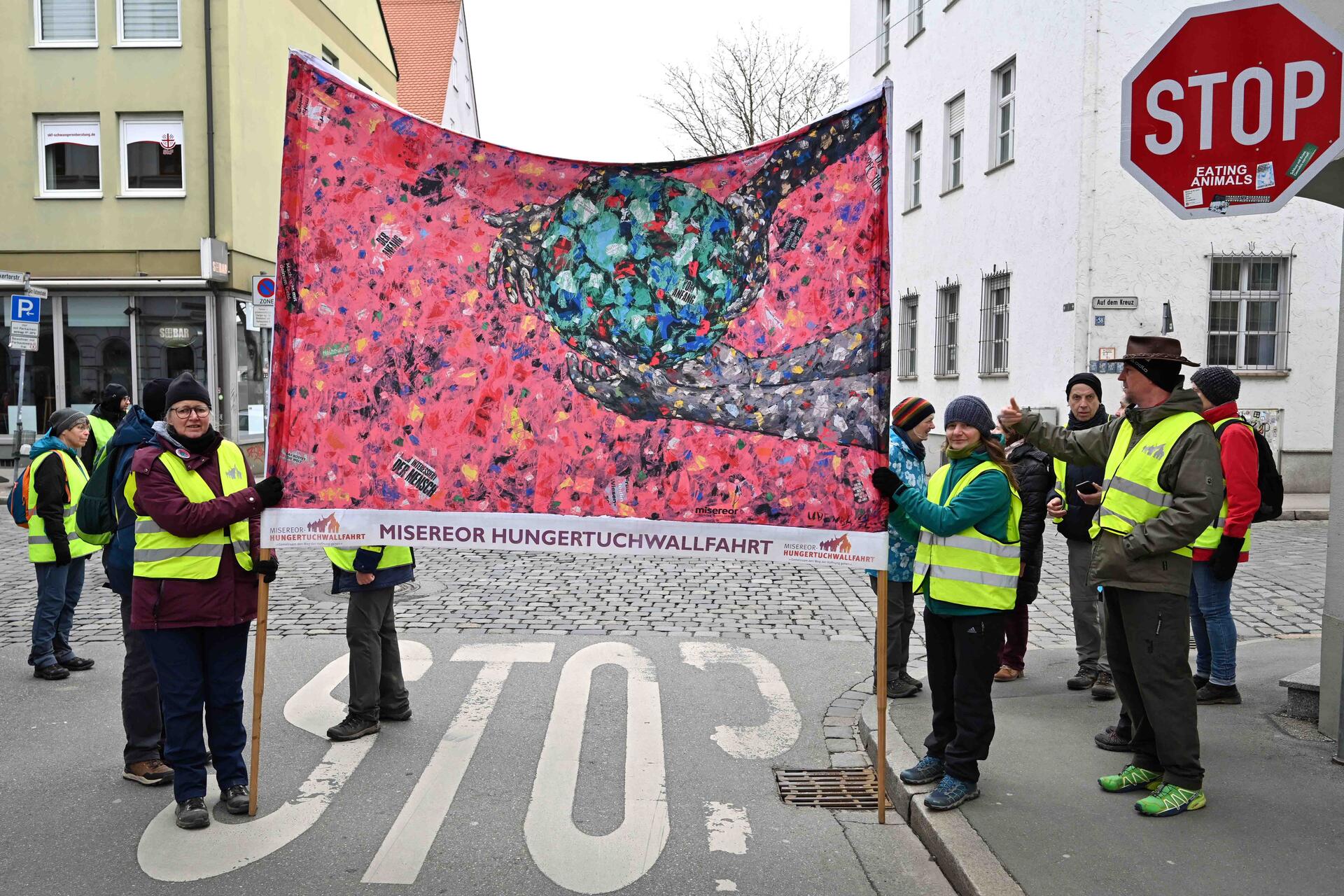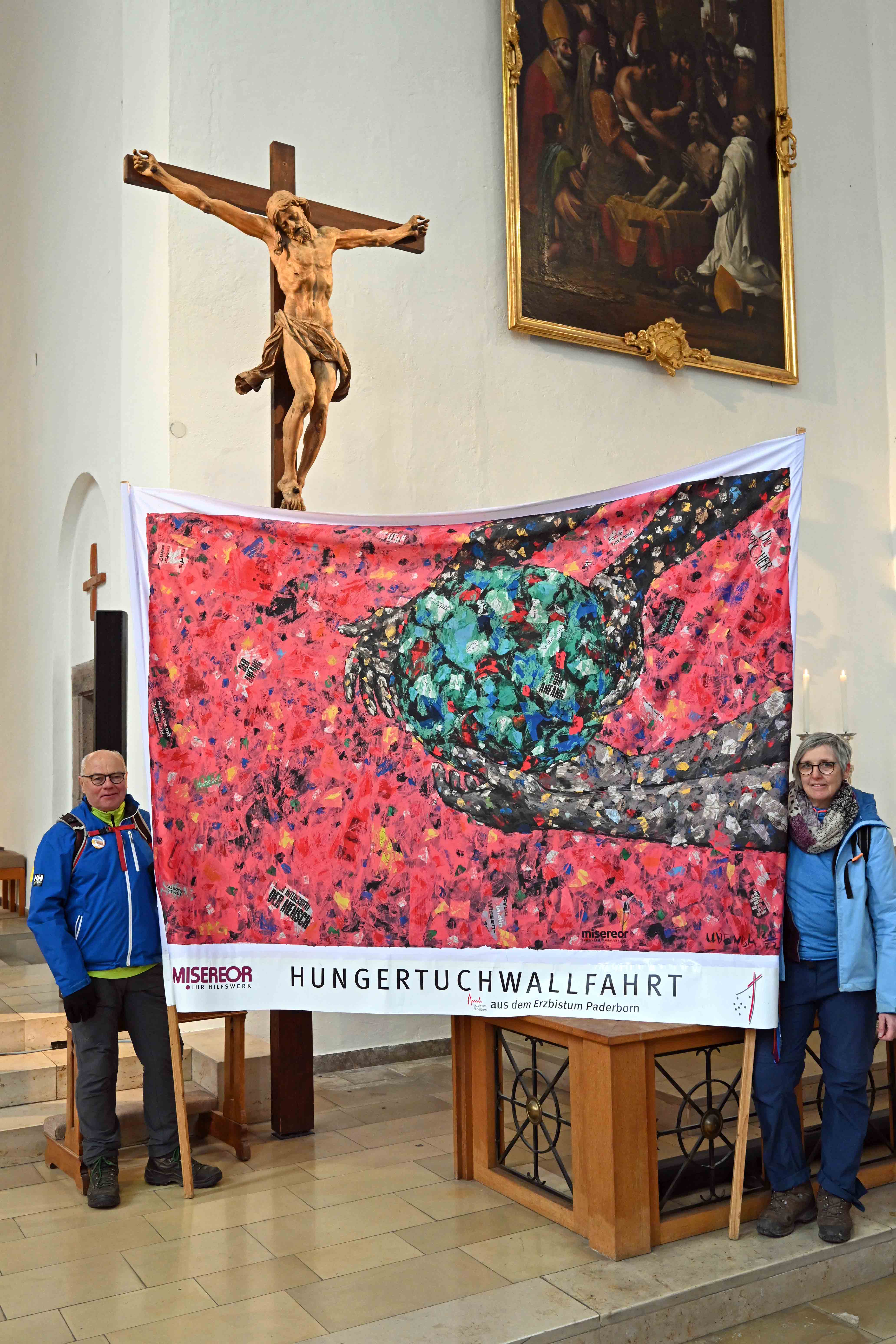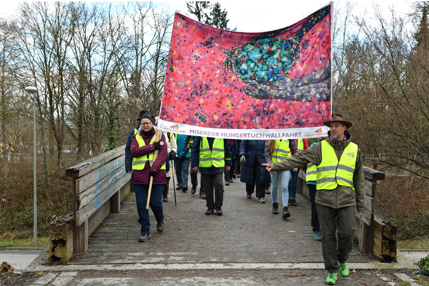Anlässlich der diesjährigen Misereor-Fastenaktion pilgerten in der Woche vor der bundesweiten Eröffnung mehrere Dutzend Wallfahrerinnen und Wallfahrer mit dem Hungertuch von Freiburg im Breisgau nach Augsburg. Dabei trotzten sie dem Wetter und legten rund um die Uhr mehr als 300 Kilometer zurück. Auf der Wegstrecke übernachteten sie, wo sie Platz fanden – in Turnhallen, Gemeinden oder Klöstern.