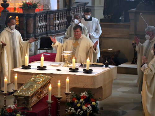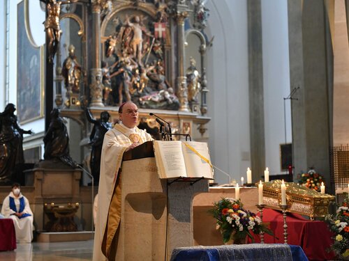 Beim Pontifikalamt zur Frauenwallfahrt stellte Bischof Bertram den hl. Josef als vorbildhaften Familien- und Adoptivvater vor. Er griff Aspekte aus dem Leben des Ziehvaters Jesu sowie des hl. Ulrich auf und deutete deren wegweisende Botschaft für das Leben von Gläubigen heute. Den Frauen versicherte er, mit Gott nie vor Überraschungen sicher zu sein. Bereits gestern Abend feierte Domkapitular Harald Heinrich die traditionelle Messe zur Männerwallfahrt.