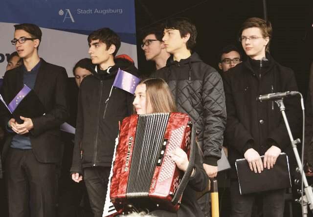 Nach einem schmackhaften Mittagessen des Küchenteams in der Adelheid-Stube brachen die Chorsänger auf zum Rathausplatz, wo sie beim Europatag mehrere Lieder singen durften. Sie begannen jeweils mit der Europa-Hymne in deutscher Sprache. Ihr buntes Programm wurde mit viel Beifall bedacht.