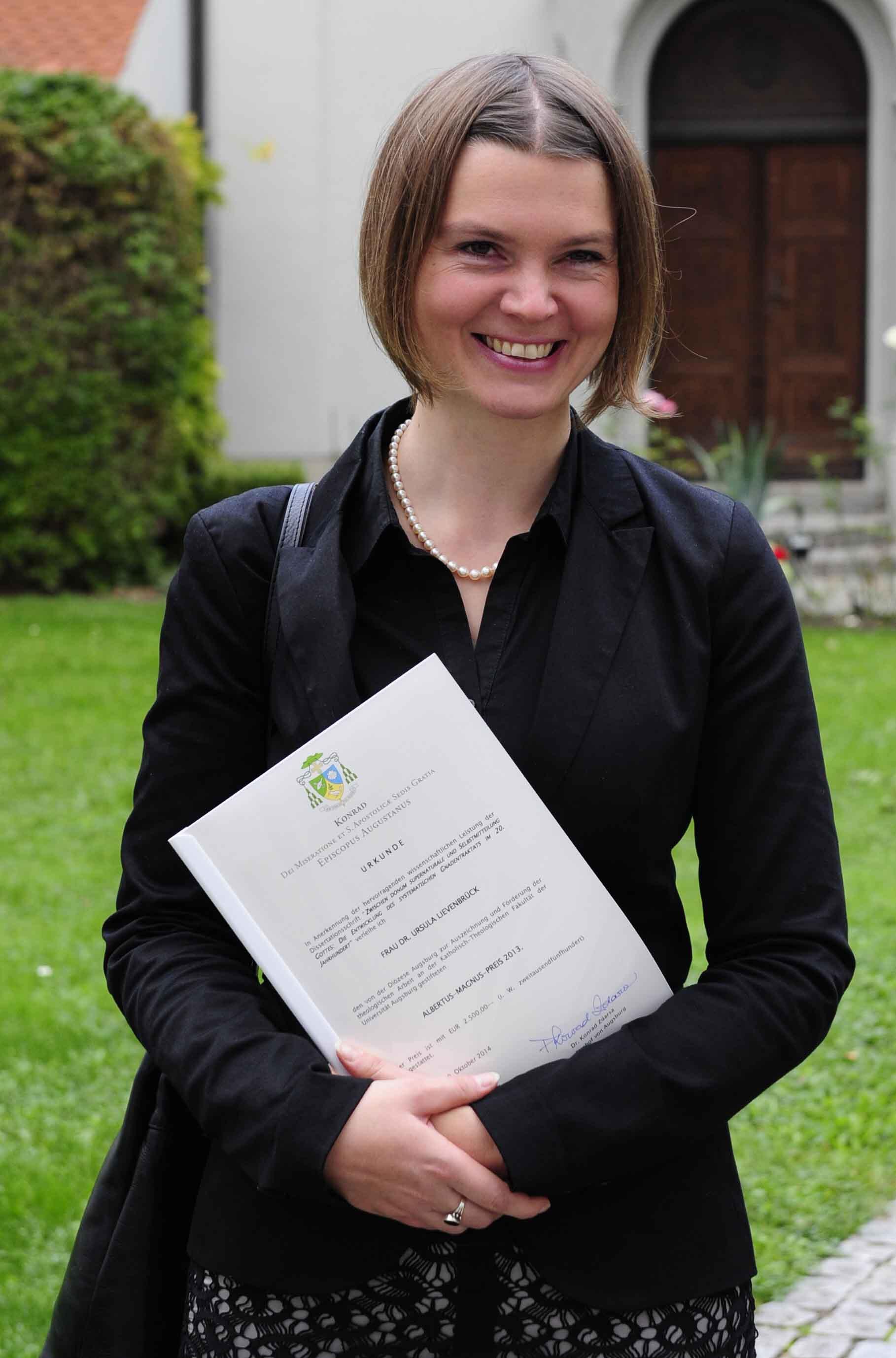 Augsburg (pba). Dr. Ursula Lievenbrück ist heute von Bischof Dr. Konrad Zdarsa für ihre Dissertationsschrift mit dem Albertus-Magnus-Preis der Diözese Augsburg für das Jahr 2013 ausgezeichnet worden. Es sei besonders erfreulich, sagte Bischof Konrad, dass nach langer Zeit wieder die wissenschaftliche Leistung einer Frau mit dem Preis geehrt werde. Frau Lievenbrück, 1979 in Essen geboren, hat sich während ihrer Dissertation mit einem Thema aus dem Fach Dogmatik befasst: „Zwischen donum supranaturale und Selbstmitteilung Gottes: Die Entwicklung des systematischen Gnadentraktates im 20. Jahrhundert“. Betreut wurde sie bei ihrer Doktorarbeit an der Katholisch-Theologischen Fakultät der Universität Augsburg von Prof. DDr. Thomas Marschler.