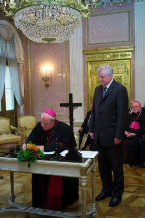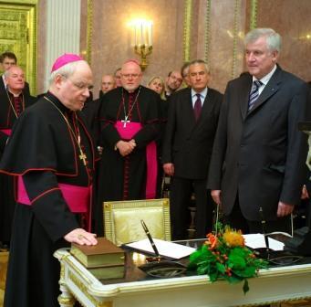 München (KNA/ pba) Konrad Zdarsa (66), ernannter Bischof von Augsburg, hat am Montag, 18. Oktober, im Münchner Prinz-Carl-Palais "Deutschland und dem Lande Bayern" die Treue geschworen. Mit der rechten Hand auf einer Bibel sprach Zdarsa vor Bayerns Ministerpräsident Horst Seehofer (CSU) die vom Konkordat vorgegebene Eidesformel. Darin verpflichtet sich ein neuer Bischof in Bayern mit seinen Priestern zur Achtung der verfassungsmäßig gebildeten Regierung.