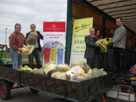 Augsburg/Burgau (aktion hoffnung). Mit einem sehr guten Sammelergebnis für Gebrauchtkleidung blicken Gregor Uhl, Geschäftsführer der aktion hoffnung, und Aufsichtsratsvorsitzender Prälat Dr. Bertram Meier auf den Abschluss der Herbstsammelaktion 2010 zurück. In Burgau wurden die letzten Tüten der Straßensammlung auf einen großen LKW verladen. Mehr als 3.000 ehrenamtliche Helfer haben in etwa 700 Pfarrgemeinden bei den Sammlungen im Frühjahr und Herbst 841 Tonnen Kleidung gesammelt.