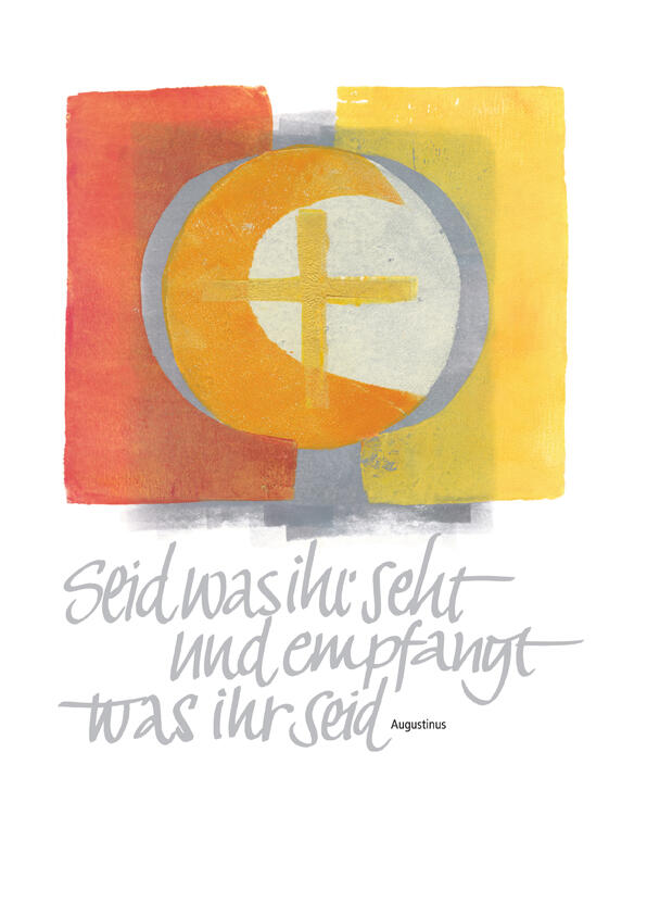 Die Augsburger Grafikerin Ruth Wild hat das eigens gewählte Stand-Motto „Seid, was ihr seht und empfangt, was ihr seid“ (Augustinus) ins Bild gesetzt: die Hostie, der Tabernakel, das Kreuzesopfer sollen die Vielfalt dieses Mottos mit kräftigen Farben veranschaulichen. Eine Postkarte mit dem Standmotiv liegt ebenso zum Mitnehmen oder Verschicken an Freunde und Bekannte bereit wie Visitenkärtchen mit Orten im Bistum, an denen die Heilige Eucharistie besonders verehrt wird.