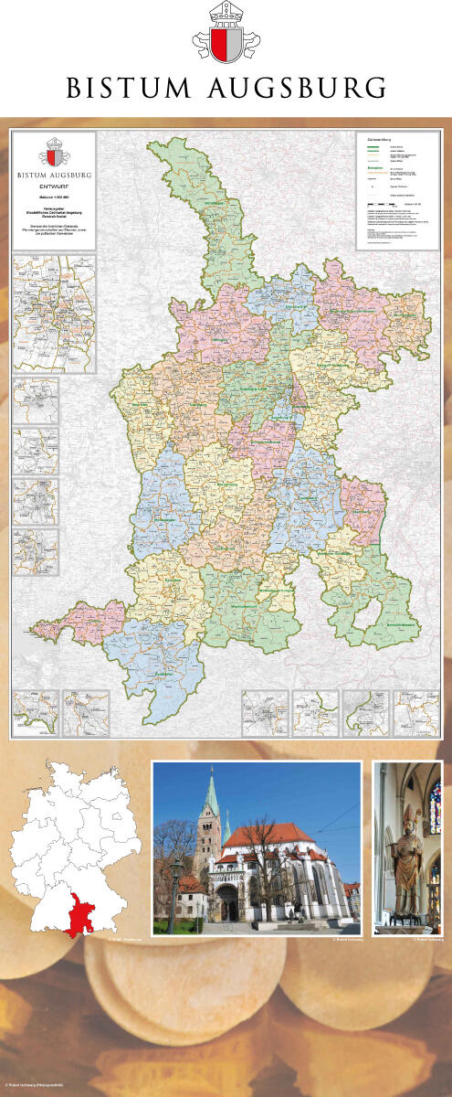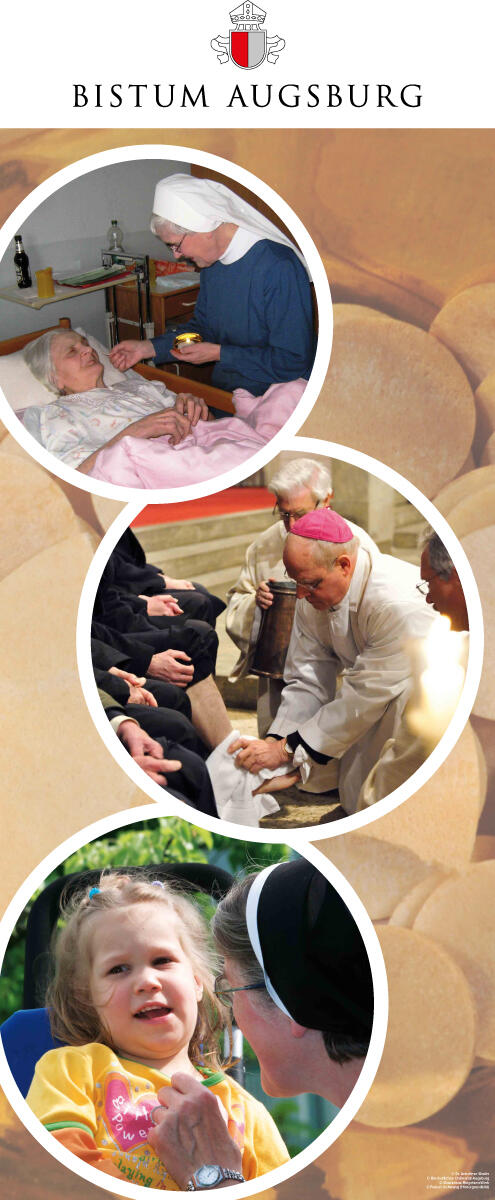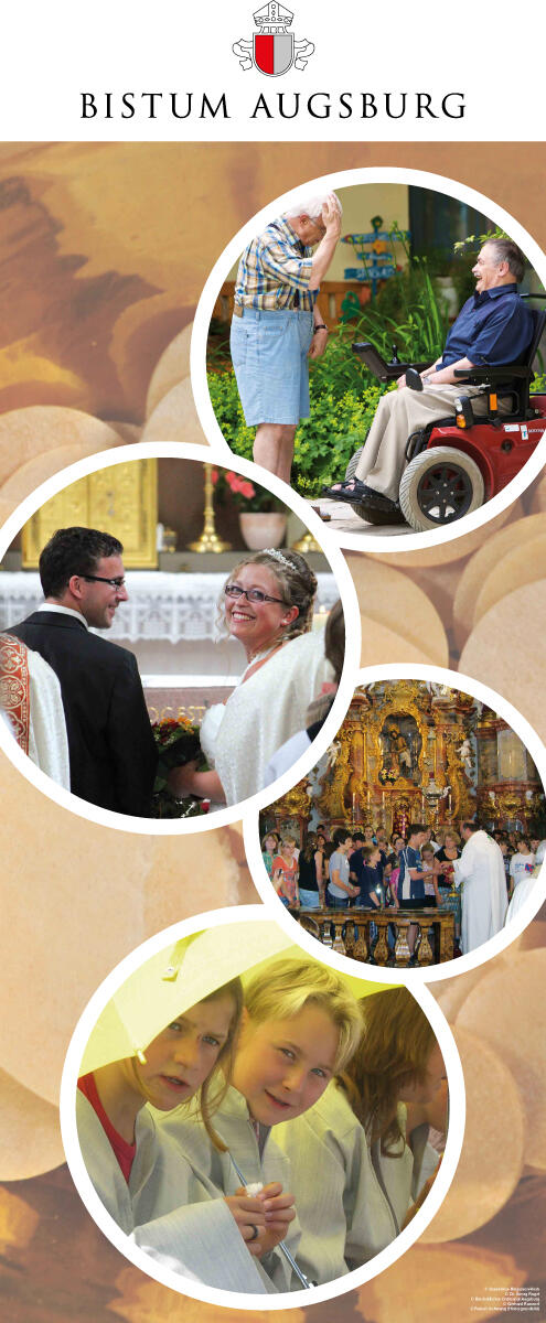 Diese Gedanken werden vor dem Panorama-Motiv eines Berggottesdienstes unter einem aufgespannten Traghimmel, wie er an Fronleichnam verwendet wird, auf vielen Bildern aus dem Leben der Kirche von Augsburg sichtbar: junge und alte Menschen, Menschen mit und ohne Behinderung, Kommunionkinder und pflegebedürftige Menschen, denen die Krankenkommunion gereicht wird.