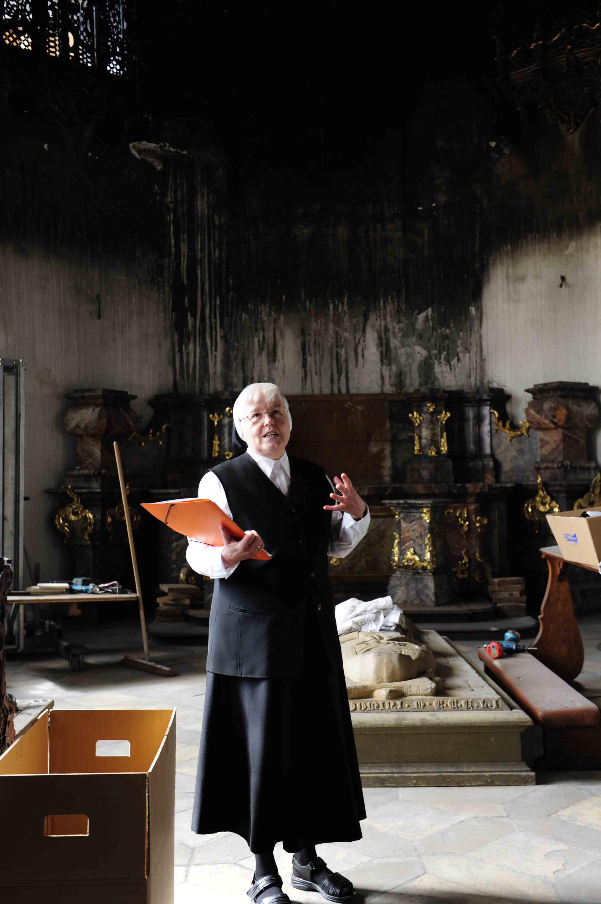 In den weitläufigen Klostergängen seien vor allem bedeutende Gemälde aus dem 17. und 18. Jahrhundert von einer immensen Rußauflage betroffen, sagte Dr. Schmid. Der Ruß habe „ein großes Schadenspotential, weil er die Farbschicht beschädigt.“ Altersbedingt hätten die Bilder unabhängig von dem Brand schon weitere Schäden gezeigt, deshalb seien mit der Rußentfernung gleichzeitig größere Arbeiten verbunden. Da die Versicherung nur für die brandbedingten Schäden aufkomme, seien die Schwestern gerade hier besonders auf Unterstützung, Spenden und Patenschaften von Seiten der Bevölkerung angewiesen.