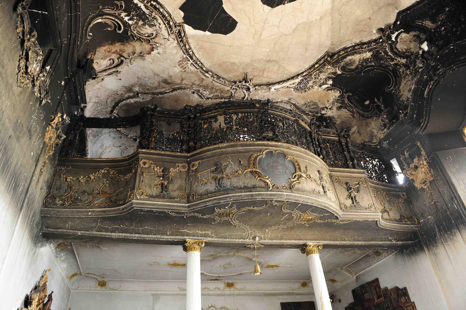 Das Feuer hatte ausgehend von der Sakristei in die angrenzende Ebner-/Margaretenkapelle übergeschlagen und dort für verheerende Schäden gesorgt: „Der Brand stellt einen der größten Katastrophenfälle in Bayern bei kirchlichem Kunst- und Kulturgut seit Ende des 2. Weltkrieges dar“, stellte Diözesankonservator Dr. Schmid fest. Die Ebner-/Margaretenkapelle hätte bis zum Brand zu den Kleinoden des schwäbischen Rokoko gezählt, sagte Schmid. Das ehemals farbprächtige Deckenfresko des Dillinger Meisters Vitus Felix Rigl sei aufs Schwerste geschädigt worden, es bestehe aber die Chance, dass man Teile des Originals retten und restaurieren könne. „In der ersten Phase ist es jetzt erstmal wichtig, alles zu retten, was zu retten ist. Derzeit laufen Erstmaßnahmen wie Notsicherungen und Bestandsaufnahmen. Die Restaurierung wird sich sicher über mehrere Jahre hinwegziehen“, so der Diözesankonservator. Auch die Sakristei, in der das Feuer ausgebrochen war, wurde schwer in Mitleidenschaft gezogen.