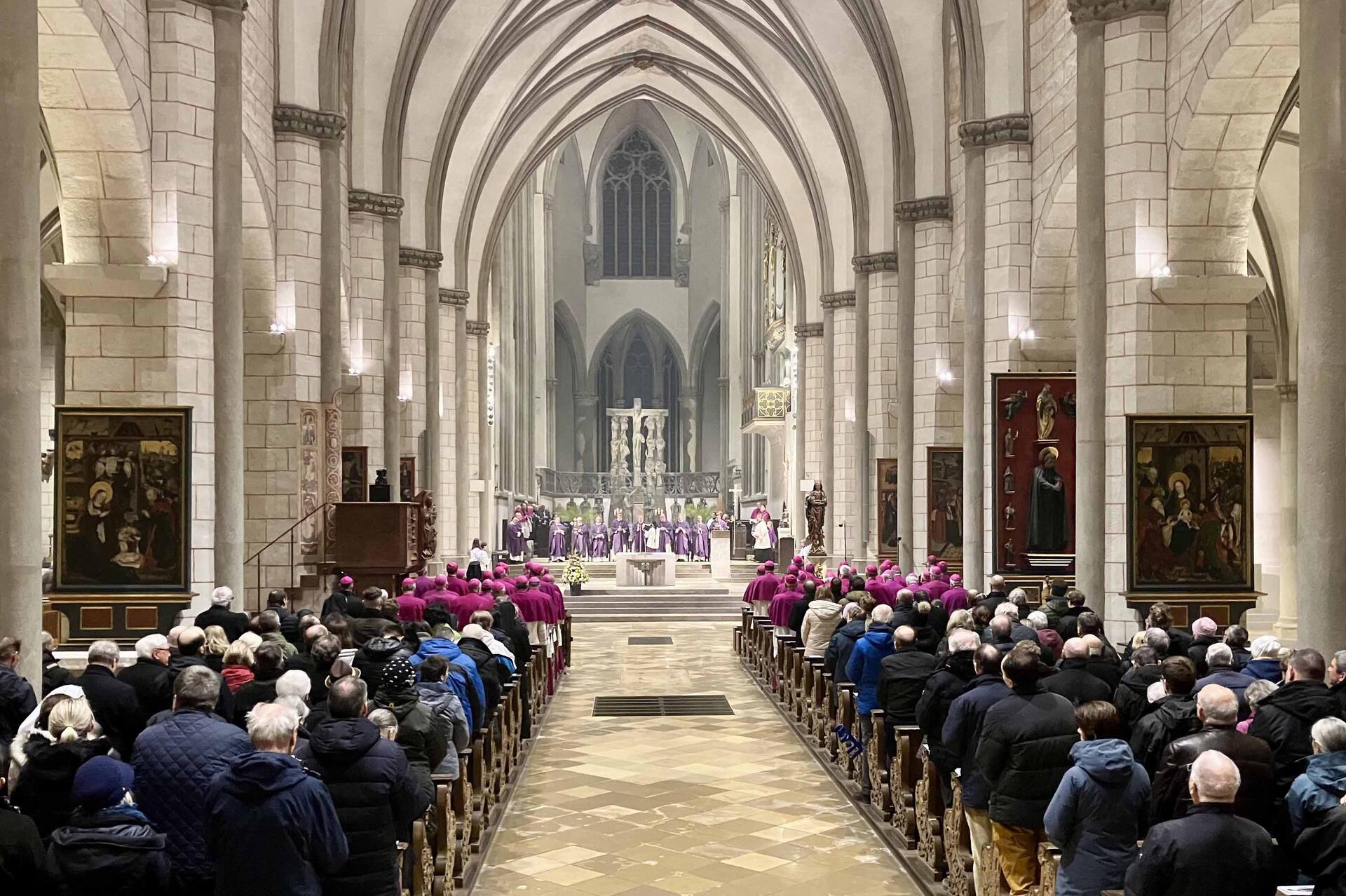 Mit dem Eröffnungsgottesdienst im Augsburger Dom hat die Frühjahrsvollversammlung der Deutschen Bischofskonferenz ihren ersten feierlichen Höhepunkt erlebt. Der gastgebende Bischof Dr. Bertram Meier ließ in seiner kurzen Begrüßung zu Beginn anklingen, dass die Vollversammlung in herausfordernden Zeiten stattfindet: "Möge uns der Heilige Geist einführen in den Zusammenklang der vielen Stimmen, die verschieden sein können, aber doch die Einheit suchen. Wir brauchen nicht immer einer Meinung sein, aber wir sollten uns mühen, immer mehr eines Sinnes zu werden – damit die Welt dem Evangelium glaubt."