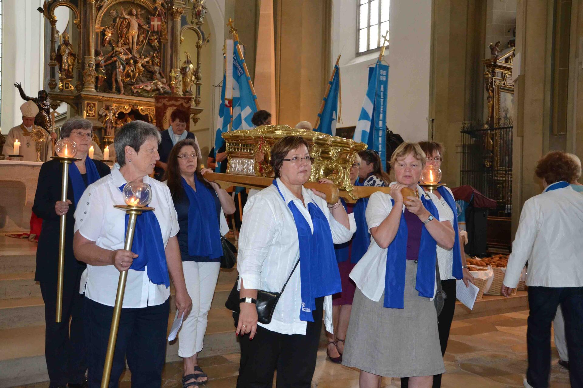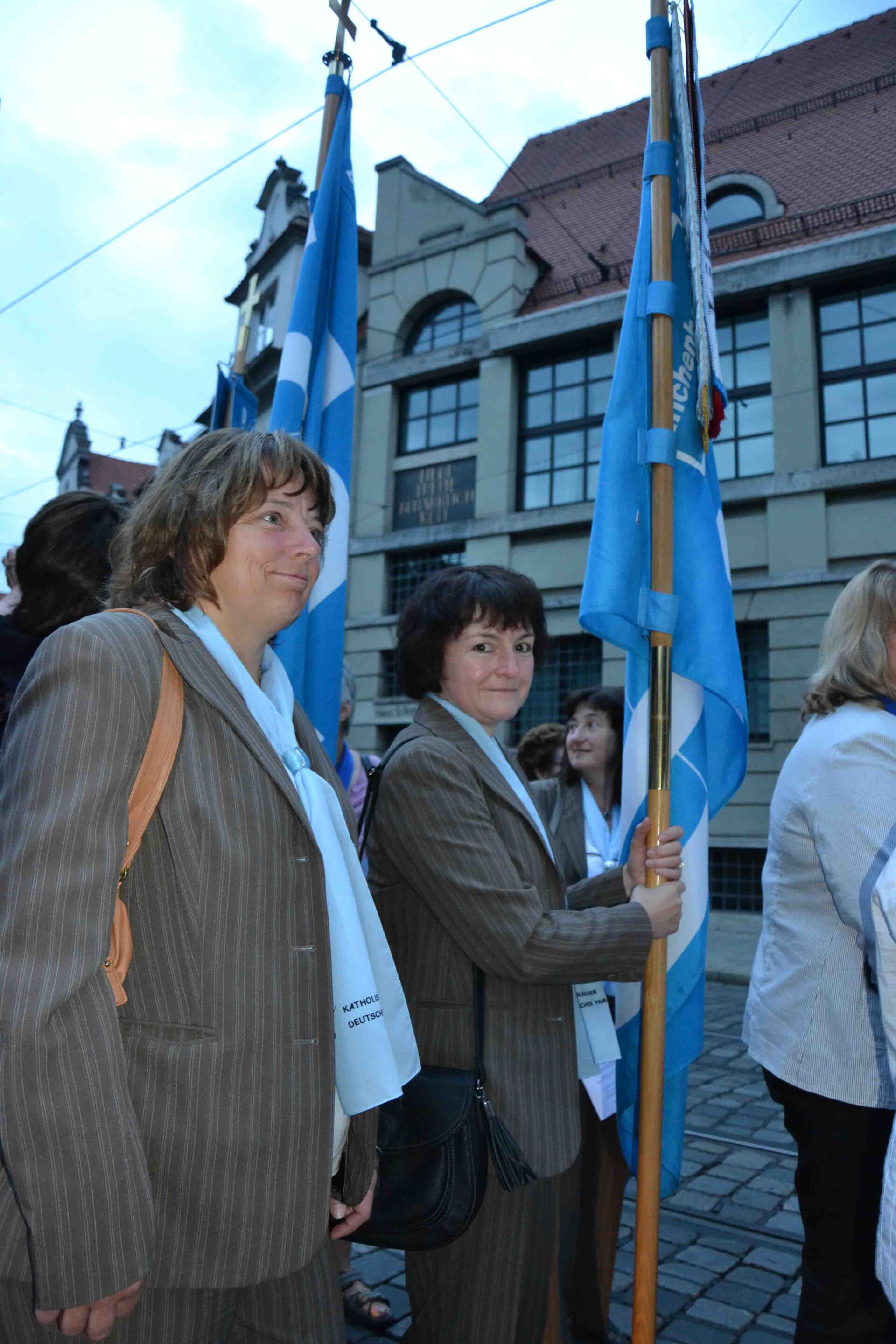 Neben dem Kreuz, das den Wallfahrerinnen vorausging, säumten auch zahlreiche blaue KDFB-Fahnen den Pilgerzug. Getragen wurden sie von Frauen aus den Zweigvereinen im Bistum.