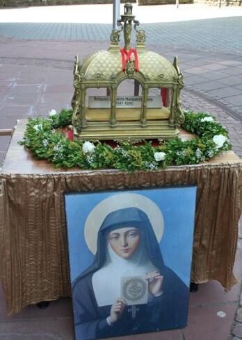 Augsburg (pba). Am 30. Juni und 1. Juli 2011 wird zum Herz-Jesu-Fest der Reliquienschrein der Hl. Margareta Maria Alacoque, der durch die ganze Welt wandert, in Mindelheim zu Gast sein. Die Hl. Margaretha Maria Alacoque (geboren am 22. Juli 1647 in Verosvres; gestorben am 17. Oktober 1690 in Paray-le-Monial) war Ordensschwester und Mystikerin. Sie gilt als „Botin des heiligsten Herzen Jesu", da wesentliche Impulse für die Herz-Jesu-Verehrung und die Einführung des Herz-Jesu-Festes von ihr ausgingen. Ihr Gedenktag wird am 16. Oktober gefeiert.