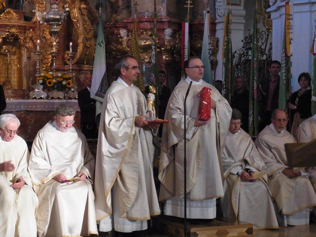 Rainer Remmeles Verabschiedung sollte gerade deshalb etwas Besonderes sein: Mit einer Bilderpräsentation, die die Zeit Remmeles bei der KLB in ihren verschiedenen Facetten beleuchtete, eröffneten die beiden Vorsitzenden des KLB-Vorstands, Elisabeth Konrad und Marcus Öfele, den Festakt, zu dem über 180 Gäste geladen waren. Ein feierlicher Gottesdienst mit Domdekan Dr. Bertram Meier und Domkapitular Dr. Michael Kreuzer in der Wieskirche wurde im Anschluss an die Eröffnung gefeiert. Prälat Bertram Meier lobte in seiner Dankesrede die vielfältigen Talente, die Energie und den geistlichen Tiefgang Remmeles. Der neue Pfarrer der Wieskirche, Monsignore Gottfried Fellner, überreichte Pfarrer Remmele eine Figur des gegeißelten Heilands und wünschte ihm auch für seine neue Aufgabe als Direktor der Regens-Wagner-Stiftung in Dillingen die Fähigkeit, das Antlitz Gottes in jedem ihm Anvertrauten zu entdecken.