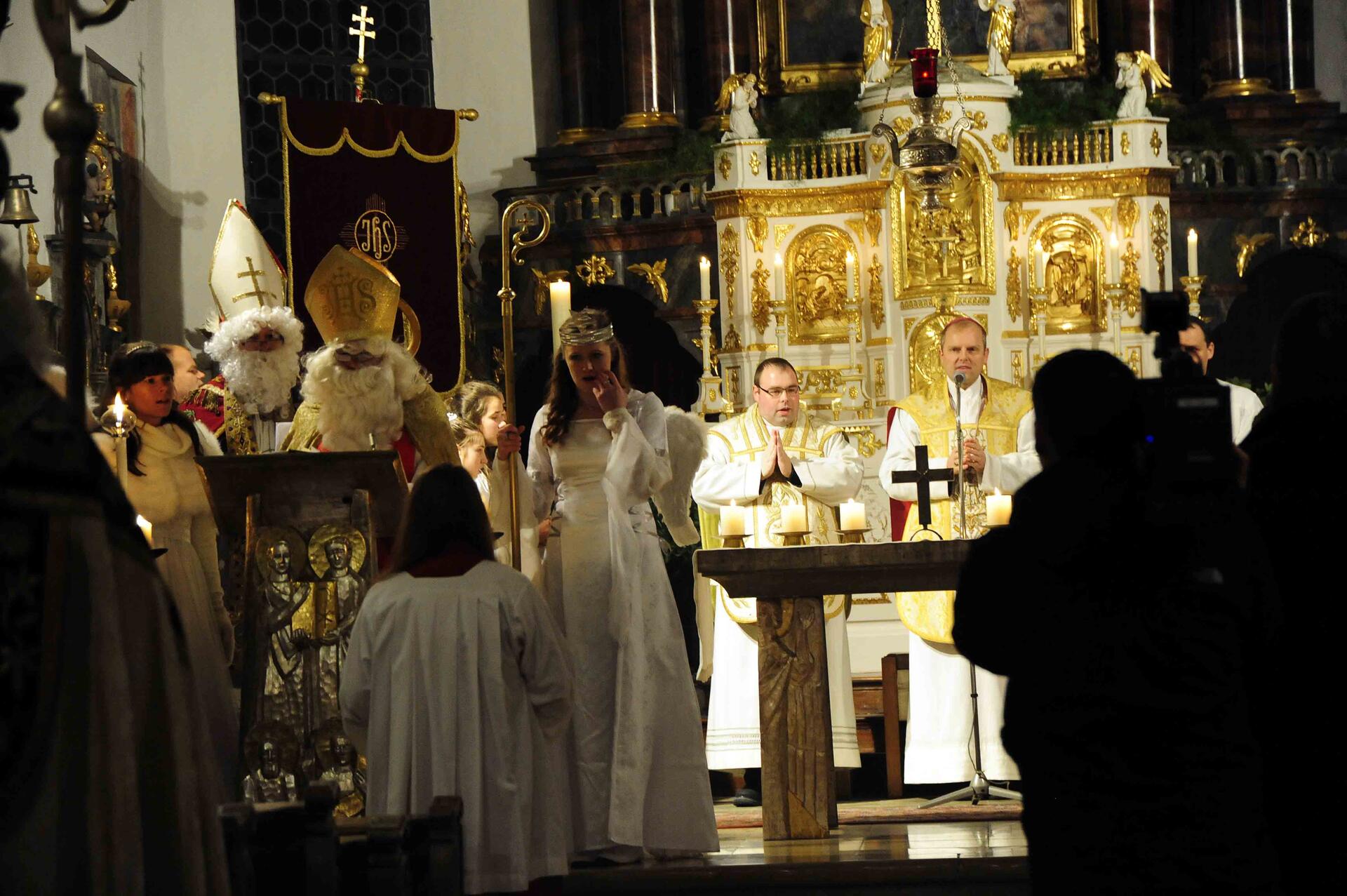 Nach einer abendlichen Prozession vom Gemeindesaal zur Kirche wurden die Nikolausdarsteller von Weihbischof Wörner sowie Pfarrer Michael Heinrich zur gemeinsamen Messfeier empfangen.