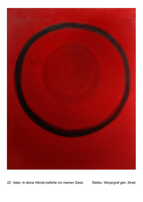 Der Theologe und Künstler Stefan Wexergraf illustriert mit neun großformatigen Bildern den diesjährigen Ökumenischen Kreuzweg der Jugend. Die Betrachtenden verfolgen die Leidensgeschichte aus dem Blickwinkel Jesu, der selbst auf keinem der Werke zu sehen ist. Jugendliche haben zu den Stationen Texte mit ihren Fragen und Antworten geschrieben.