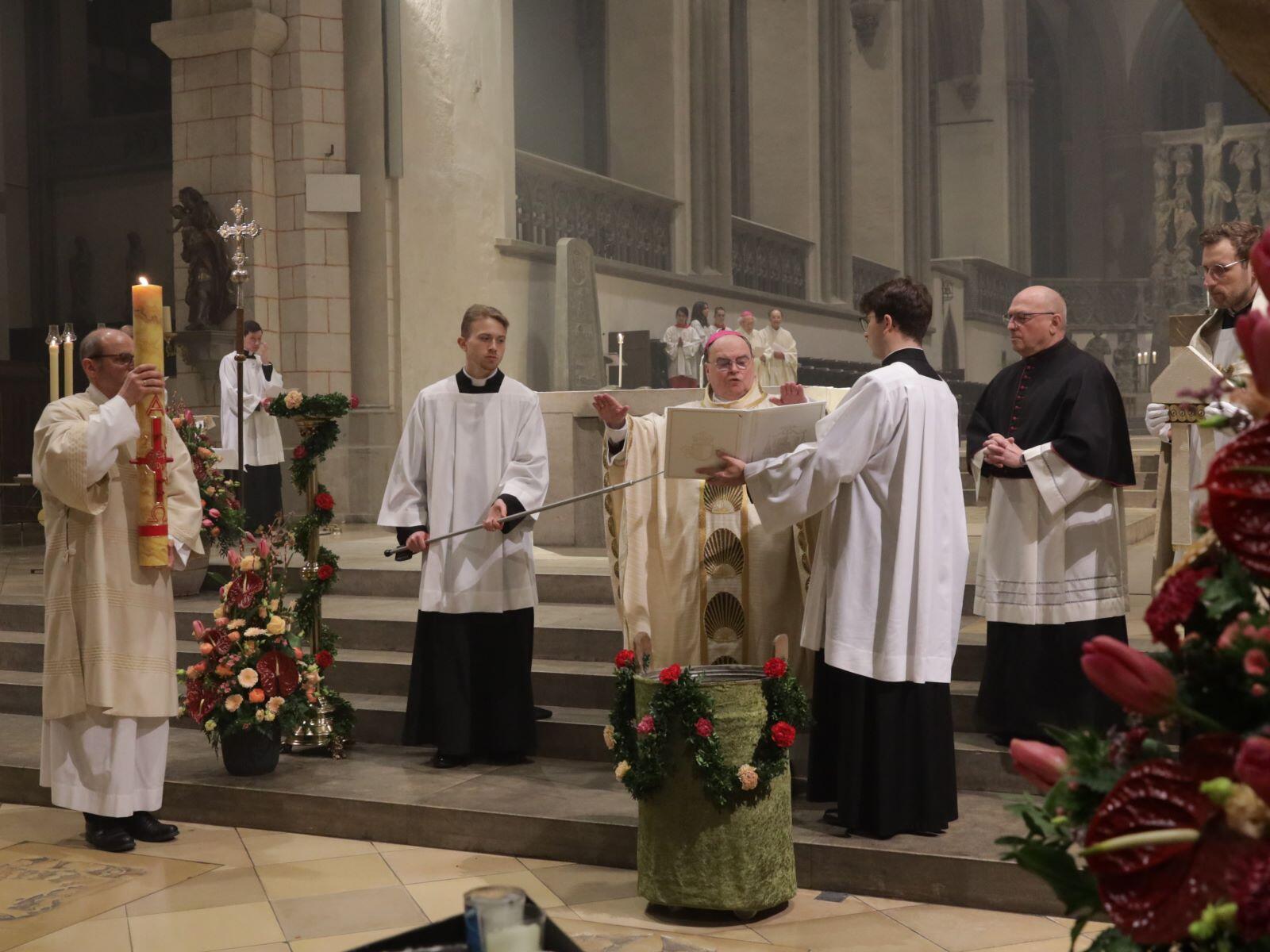 Die Osternacht wurde im von zahlreichen Kerzen erleuchteten Hohen Dom feierlich begangen. Im Gottesdienst wurde, einem uralten Brauch der Kirche folgend, durch Bischof Bertram zudem eine Taufe vorgenommen und der kleine Täufling damit symbolisch der Gemeinde vorgestellt und in diese aufgenommen. Musikalisch wurde der Festgottesdienst von einer Schola der ehemaligen Augsburger Domsingknaben mit geistlichen Chorsätzen begleitet. Der Gottesdienst wurde zudem live im Fernsehen auf augsburg.tv und allgäu.tv übertragen. Der Kammerchor der Augsburger Domsingknaben sang am Ostersonntag die „Missa Virgo Prudentissima“ von Heinrich Isaac, begleitet von einem Bläserensemble.