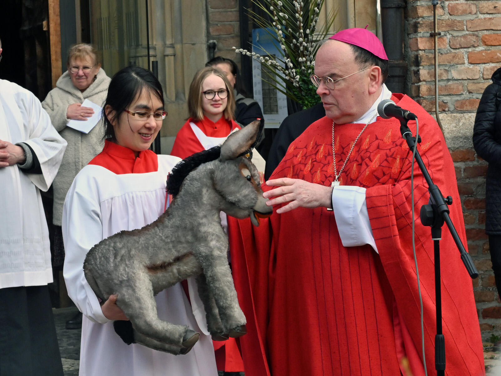 Trotz des eher trüben Wetters hatten sich zahlreiche Gottesdienstbesucher vor dem ansonsten verschlossenen Bronzeportal des Doms versammelt, um mit der gemeinsamen Prozession in die Kathedralkirche hinein liturgisch an den Einzug Jesu in die heiligste Stadt des Judentums anzuknüpfen. Gemäß jahrhundertealtem Brauchtum segnete der Bischof unter den Klängen des „Hosanna filio David“ auch die Palmzweige. Diese Tradition knüpft an die biblische Überlieferung an, in der es heißt, dass die Menschen Jerusalems Palmzweige von den Bäumen schnitten und auf dem Weg vor Jesus ausbreiteten (Mt 21,8). Die Palmbuschen werden traditionell im darauffolgenden Jahr im Osterfeuer verbrannt. Deren Asche wird bei der Austeilung des Aschekreuzes genutzt.