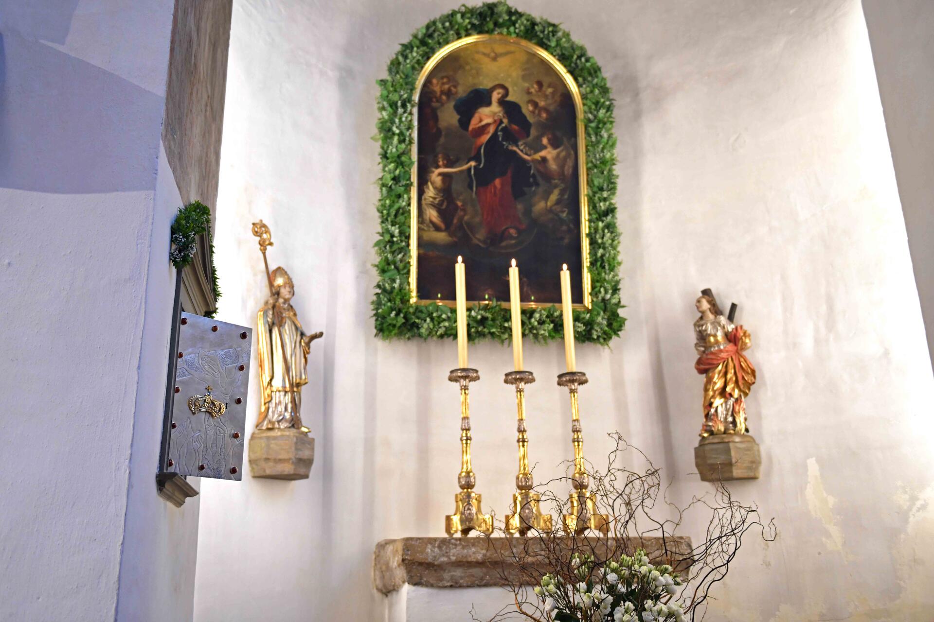 Augsburg (pba). Die große Wertschätzung von Papst Franziskus für das Gnadenbild Maria Knotenlöserin in der Kirche St. Peter am Perlach in Augsburg ist weithin bekannt. Einen besonderen Ausdruck fand diese, als er für das Bildnis eine Krone anfertigen ließ, eine Kopie des Originals in Rom damit krönte und das kostbare Stück Bischof Bertram überreichte. An diesem Mittwoch feierte der Bischof eine Maiandacht in der Kirche St. Peter am Perlach, wo er die päpstliche Krone nahe dem Bild befestigte.