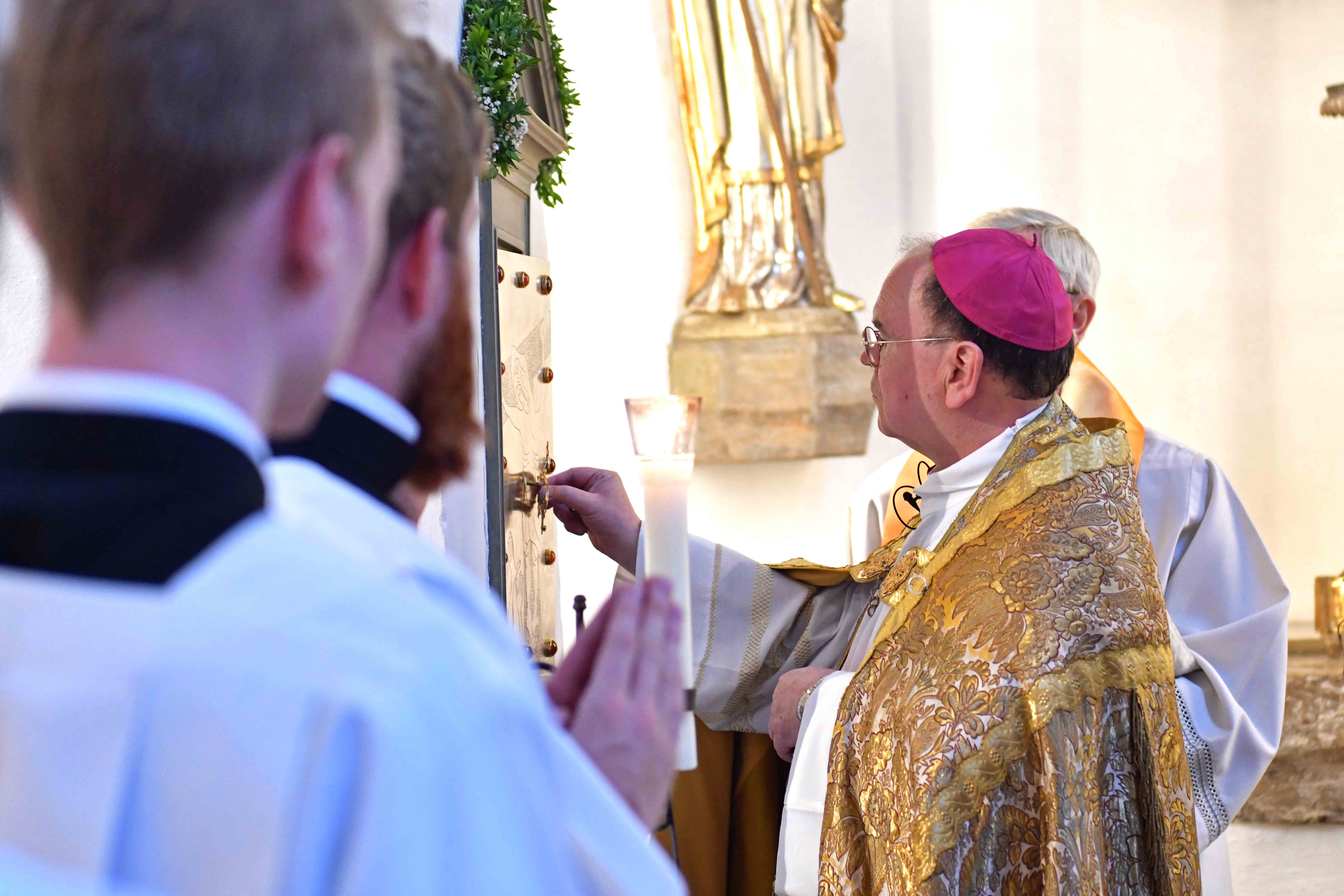In seiner Predigt lud Bischof Bertram die Gottesdienstbesucher zu einem Gedankenexperiment ein, sich vorzustellen wie die Kirchengeschichte aussähe, wenn sie ganz anders geschrieben wäre: „nicht als Papstgeschichte, nicht als Geschichte der Triumphe und Skandale, sondern als Geschichte des Gebetes“. Dies sei zwar ein schwieriges Unterfangen, gab er zu, aber gerade daran wäre zu erkennen, wie oft durch das Gebet die Entscheidungen der Kirche vorbereitet und mitgestaltet wurden. „In den Hauptrollen fänden wir die Stillen und Schwachen, die gleichzeitig stark sind im Gebet“, betonte der Bischof. Ein wichtiges Kapitel dieser Geschichte gebühre der heiligen Crescentia von Kaufbeuren, deren Reliquien sich ebenfalls in dieser Kirche befänden.