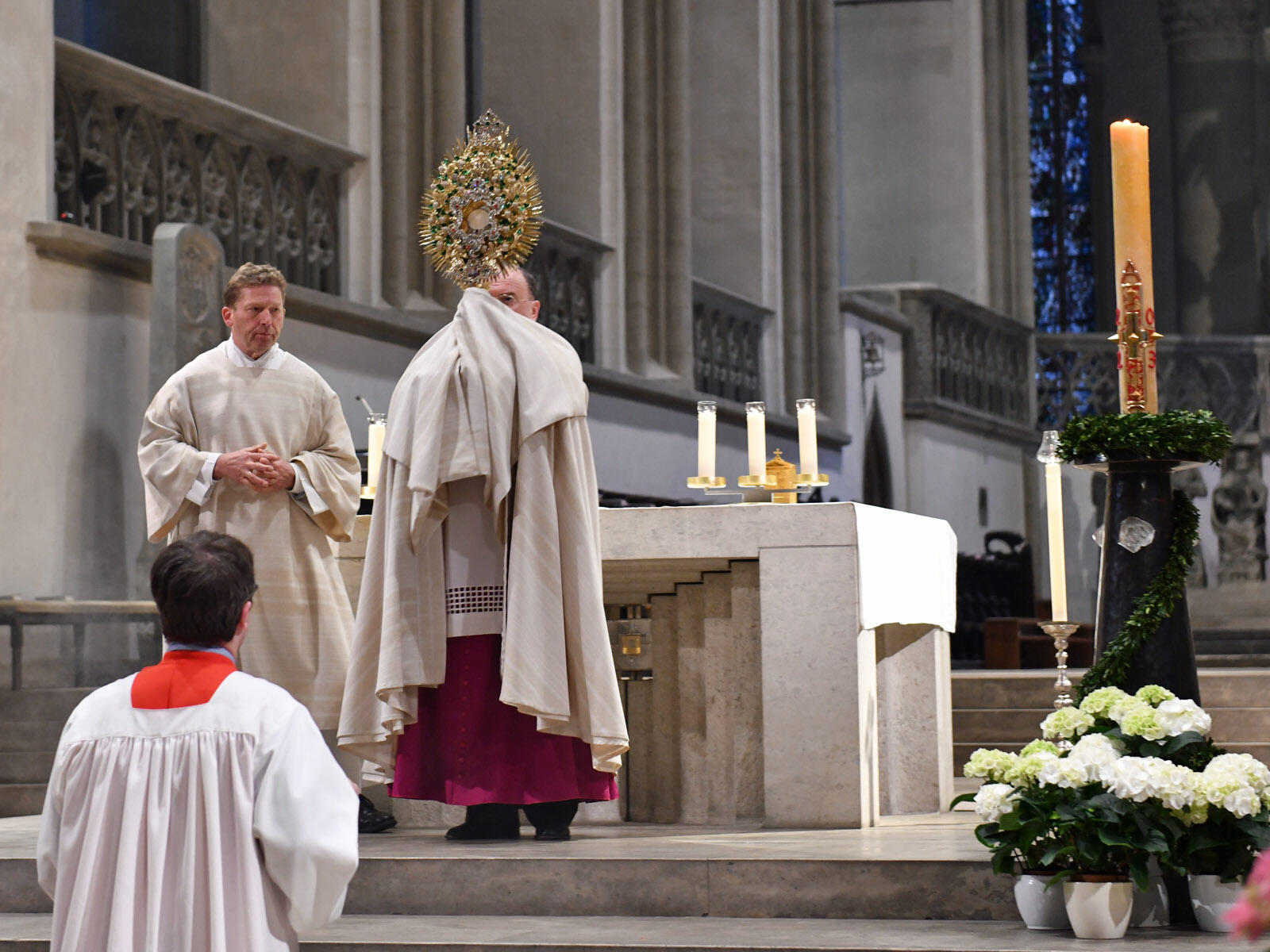 Der Kammerchor der Augsburger Domsingknaben umrahmte die Maiandacht durch Marianische Motetten und Gesänge musikalisch. Zum Ende erklang im nahezu vollbesetzten Dom das Lied "Maria, Himmelskönigin" (Gl A 867), das im Refrain die folgende Bitte ausspricht: "Patronin voller Güte, das Bayernland behüte."