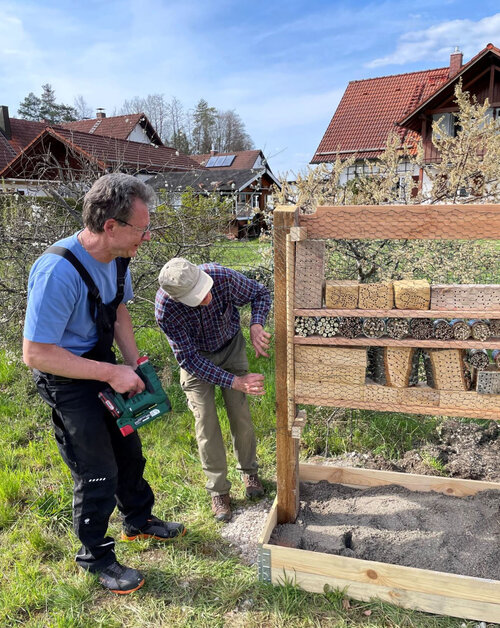 Insgesamt wurde sehr bedacht und unter Einbeziehung externer Fachleute vorgegangen: So wurden für das Insektenhotel Empfehlungen des Naturschutzbundes Deutschland (NABU) und des BUND Naturschutz berücksichtigt. Das Saatgut für die Blühwiese bestand aus einer Mischung speziell für das südliche Alpenvorland. Und für den Umbau der Thujenhecke wurde bei der Landesanstalt für Gartenbau in Veitshöchheim Rat eingeholt.