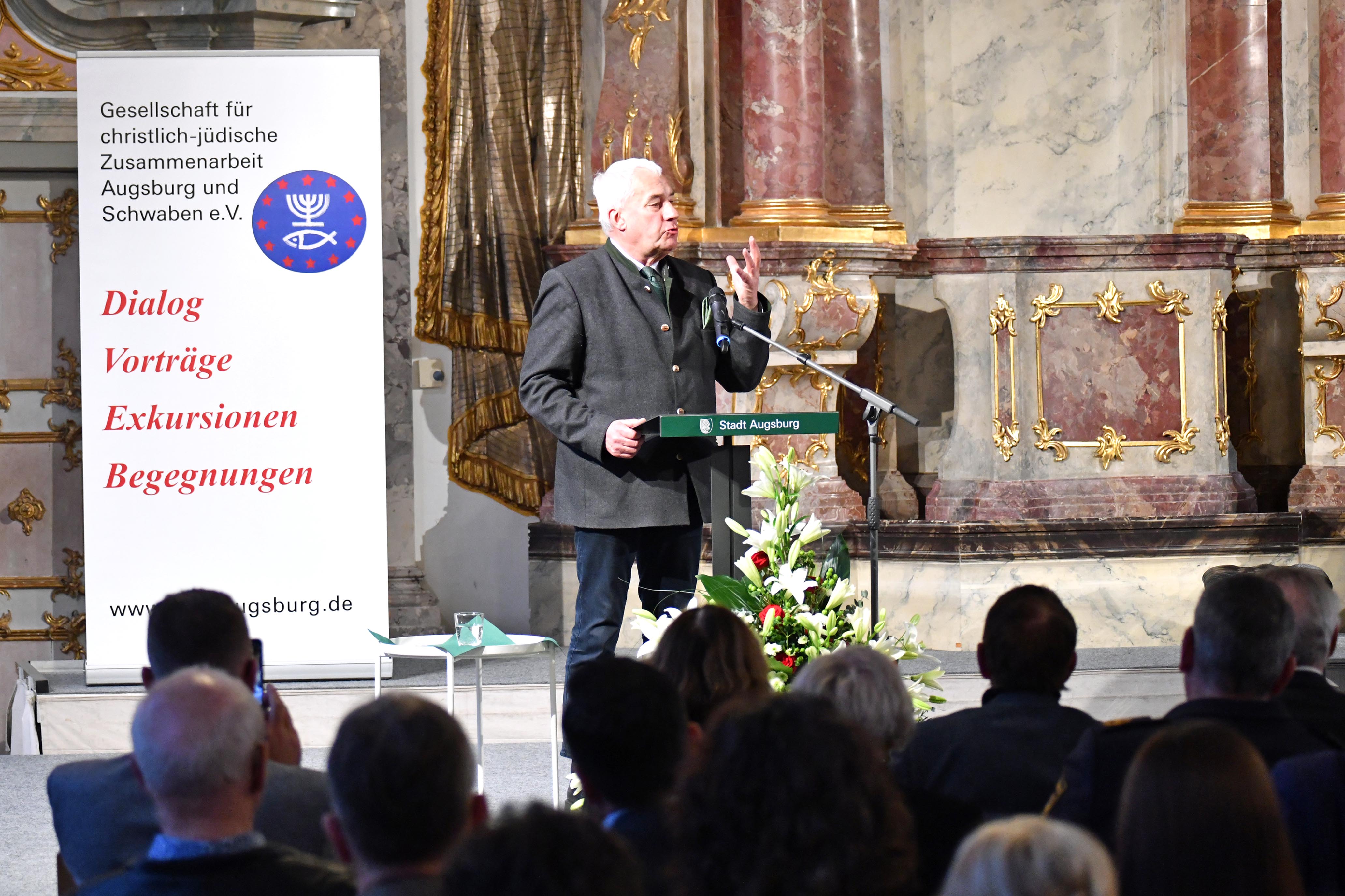 Nach den Grußworten aus Kirche, Politik und Gesellschaft ließ es sich der Festredner des Abends, Dr. Ludwig Spaenle, nicht nehmen, für mehr Sensibilität und Wachsamkeit innerhalb der deutschen Gesellschaft zu werben, speziell wenn es um die Menschenwürde und die Bürgerreichte von Menschen jüdischen Glaubens geht. Seit 2018 ist der frühere Staatsminister für Unterricht und Kultus nun schon Beauftragter der bayerischen Staatsregierung für jüdisches Leben und gegen Antisemitismus, für Erinnerungsarbeit und geschichtliches Erbe. So würdigte er in seiner Rede die Menschen aus den beiden christlichen Kirchen, die auf einem „Berg von Schuld“ im Nachkriegsdeutschland begannen, mit den teils wieder neu entstehenden jüdischen Gemeinden einen Dialog auf Augenhöhe zu führen.