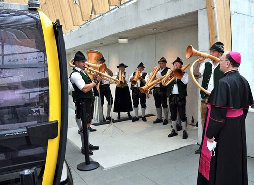 Nach einer musikalischen Darbietung der Buchenberger Büchlbläser mit ihren von Richard Brutscher selbstgebauten Holzblasinstrumenten begrüßte der Vorsitzende des Aufsichtsrates der Nebelhornbahn-AG Michael Lucke die Gäste im Gebäude der neuen barrierefreien 10er-Kabinen-Umlaufbahn. Nach nur einem Jahr Bauzeit sei die höchste Bergbahn des Allgäus im Mai 2021 in Betrieb gegangen. Die Region lebe vom Tourismus, dieser sei ein wichtiger Wirtschaftsfaktor in Bayern, wandte Lucke sich an die Anwesenden. Die beiden Vorstände der Nebelhornbahn AG, Johannes Krieg und Henrik Volpert, blickten in ihrer Ansprache auf die Geschichte der Seilbahn zurück. Mit der Einweihung im Jahr 1930 habe man damals eine mutige Entscheidung getroffen, so Krieg. Die Jahrhundertkrise Corona habe leider den Bau der jetzt fertiggestellten Bahn überschattet - die Krise werde große Auswirkungen auf die Bilanzen für die kommenden Jahre haben.