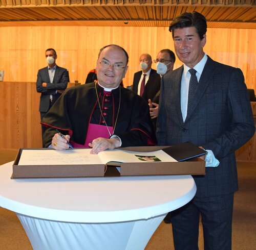 Oberstdorf (pdsf). „Die Seilbahn hilft uns nach oben zu kommen, um dort das Panorama zu genießen. Auf dem Gipfel steht das Kreuz, es krönt den Berg und steht für den Gipfel der Schöpfung“, beschrieb Bischof Dr. Bertram Meier am heutigen Donnerstag bei der Segnung der neuen Nebelhornbahn in Oberstdorf die Bedeutung des Gipfelkreuzes. Der Bischof appellierte im Beisein des bayerischen Ministerpräsidenten Dr. Markus Söder, die Natur als Garten Gottes zu hegen und zu pflegen. „Wo wir weiter Schöpfung zerstören, wird einst die Schöpfung uns ruinieren. So ist dieser Tag Geschenk und Auftrag zugleich“, bemerkte er vor zahlreichen Ehrengästen aus dem politischen und kirchlichen Leben, bevor er gemeinsam mit dem evangelischen Regionalbischof Axel Pieper die Seilbahn segnete.