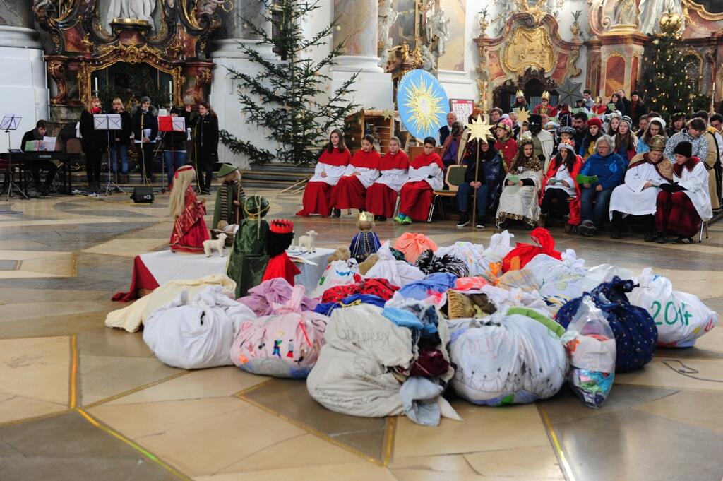 Sowohl der Empfang im Schulzentrum als auch der Gottesdienst im Anschluss standen unter dem Thema der diesjährigen Sternsingeraktion: „Segen bringen – Segen sein. Für Flüchtlingskinder in Malawi und weltweit“. Jede Sternsingergruppe brachte passend zum Motto ein Paket mit, das gefüllt war mit Kleidungsstücken und Kuscheltieren. Die Kleidersäcke sollten an Pakete erinnern, die Flüchtinge oft als einziges Stück ihrer Heimat mit sich tragen können. Szenisch wurde das diesjährige Sternsingermotto von einer Sternsingergruppe aus der Pfarrei Böhen umgesetzt: Die Jugendlichen machten mit einem Theaterstück darauf aufmerksam, was es für Kinder und Jugendliche bedeutet, in einem Flüchtlingscamp untergebracht zu sein.