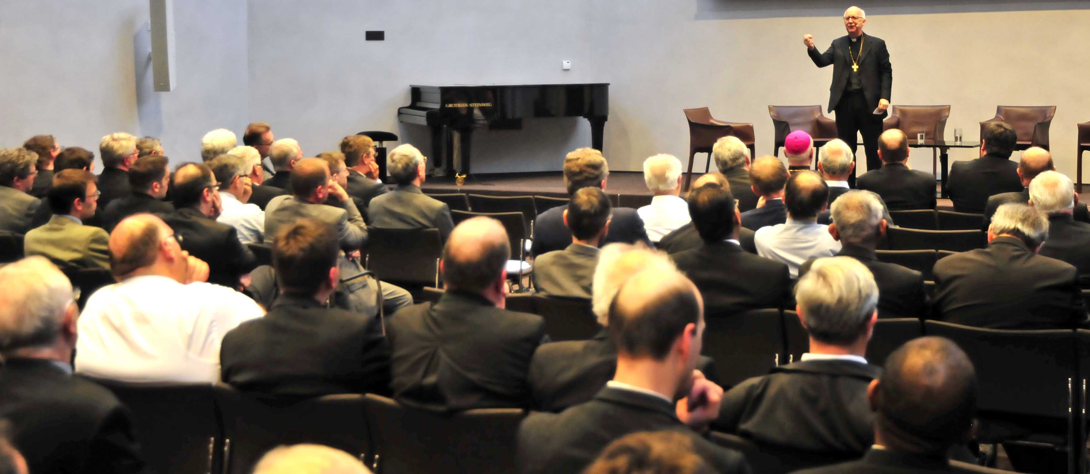 Augsburg (pba). Weihbischof Marian Eleganti aus der Schweizer Diözese Chur hat heute beim „Tag der Priester und Diakone“ im Rahmen der Ulrichswoche vor rund 100 Teilnehmern im Haus St. Ulrich mit eindrucksvollen Worten die theologische und geistige Bedeutung des Bußsakraments unterstrichen. Um die Beichtpraxis wieder zu stärken, sei es Aufgabe des Beichtvaters, den Beichtenden dort zu begleiten, wo dieser sich selber erkennt und Einsicht in seine Schuld hat, und ihn nicht mit falschen Ratschlägen zu verführen, betonte Weihbischof Eleganti. „Ich kann nicht einfach eine fromme Flöte spielen und dem Beichtenden meine Einsichten aufdrücken“, warnte er. Der Priester sei schließlich kein Orakel, sondern müsse im Beichtgespräch „Hebammendienste leisten“.