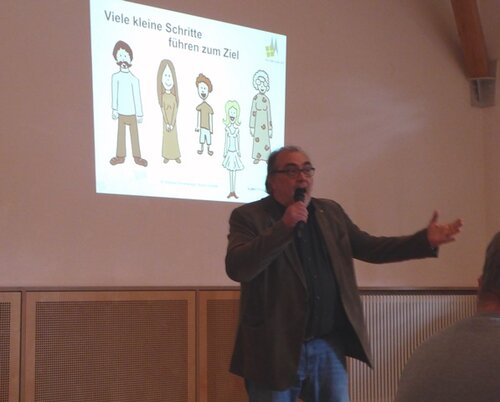 Für diese Einstellung stand auch Bernd Grünauer, der Klimaschutzmanager der Diözese Eichstätt mit seinem Vortrag Viele kleine Schritte führen zum Ziel. Jede Pfarrei kann beginnen, Schritt für Schritt umweltbewusster im Sinne von klima- und ressourcenschonender zu werden, aber auch im Bereich der Ernährung etwas für die Würde des Mitgeschöpfs Tier zu tun. Wie ist der Strom-, Gas- und Wasserverbrauch? Laufen am Wochenende unnötigerweise Heizungen und elektrische Geräte (Standby)? Gibt es auf dem Pfarrfest Produkte aus der Region, vielleicht sogar in Bioqualität? Solche Überlegungen stellt systematisch an, wer ein Umweltzertifikat erwerben möchte. Neuerdings gibt es ein kostengünstiges und extra für Kirchengemeinden entwickeltes Zertifikat namens "Der grüne Gockel". Auch das war eine praktische Erkenntnis, die die weit über 100 Teilnehmer neben einer Checkliste (siehe unten) mit nach Hause nehmen konnten.